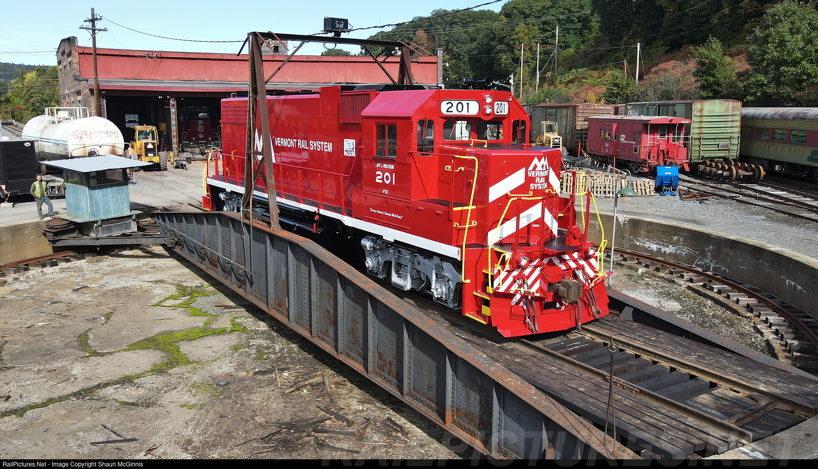 | Vermont Railway GP38-2 201, one of two purchased new by the railroad, basks in the morning sun in North Walpole NH. |