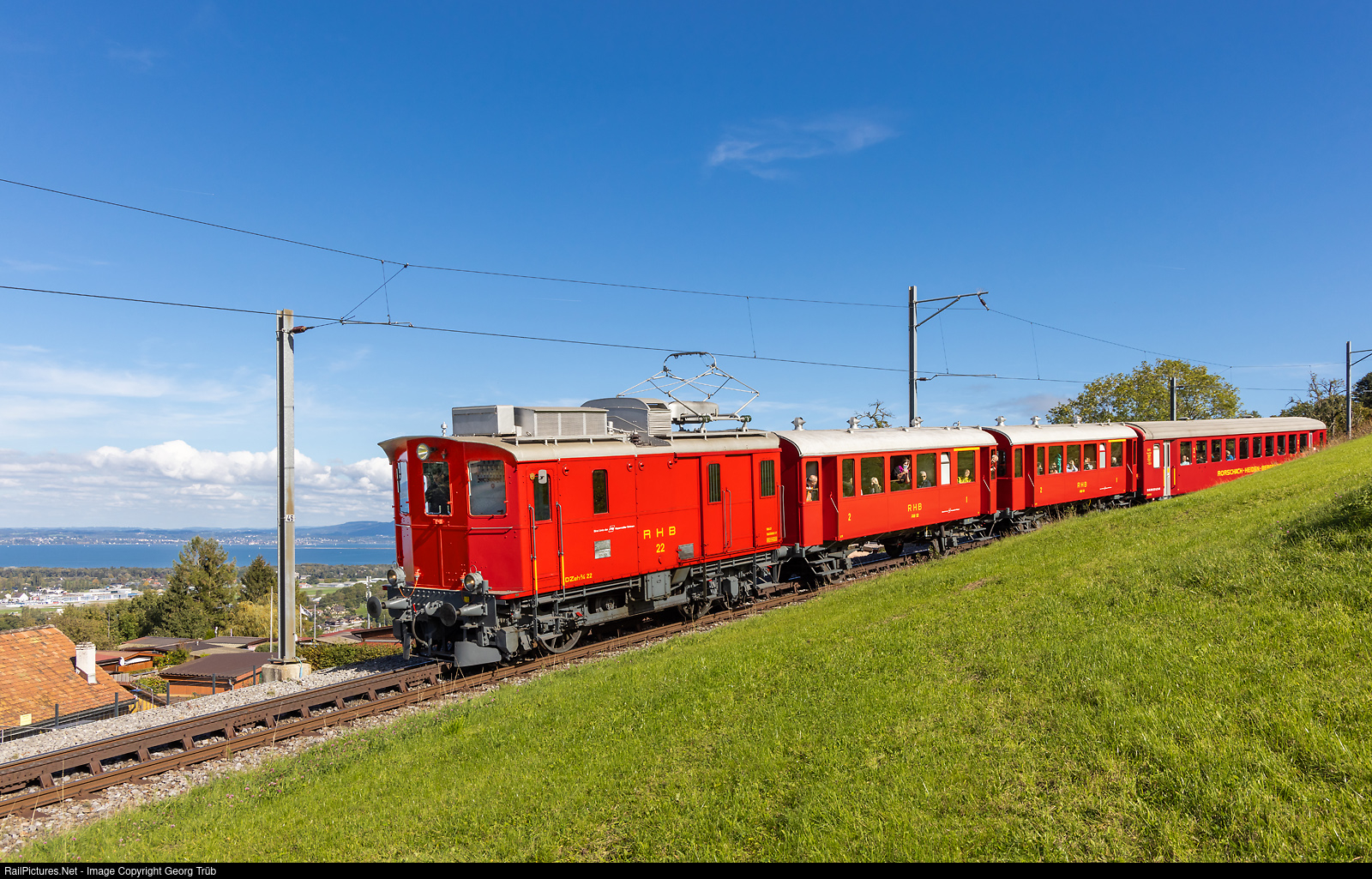 Cogwheel locomotive, according the designation a railcar with baggage and mail compartment, DZeh 2/4 of the Rorschach-Heiden-Bergbahn (RHB), nowadays part of the Appenzeller Bahnen, is running down below Wartensee with cars AB # 12 and # 13 and B # 11. DZeh 2/4 # 22 was built by SLM and MFO in 1930, the two twoaxle cars were built in 1930 too, by SIG Neuhausen. The B # 11 was built for the SBB as standard car type I second class B # 8202 in 1962 with an aluminum carbody and is with the RHB since 1971.