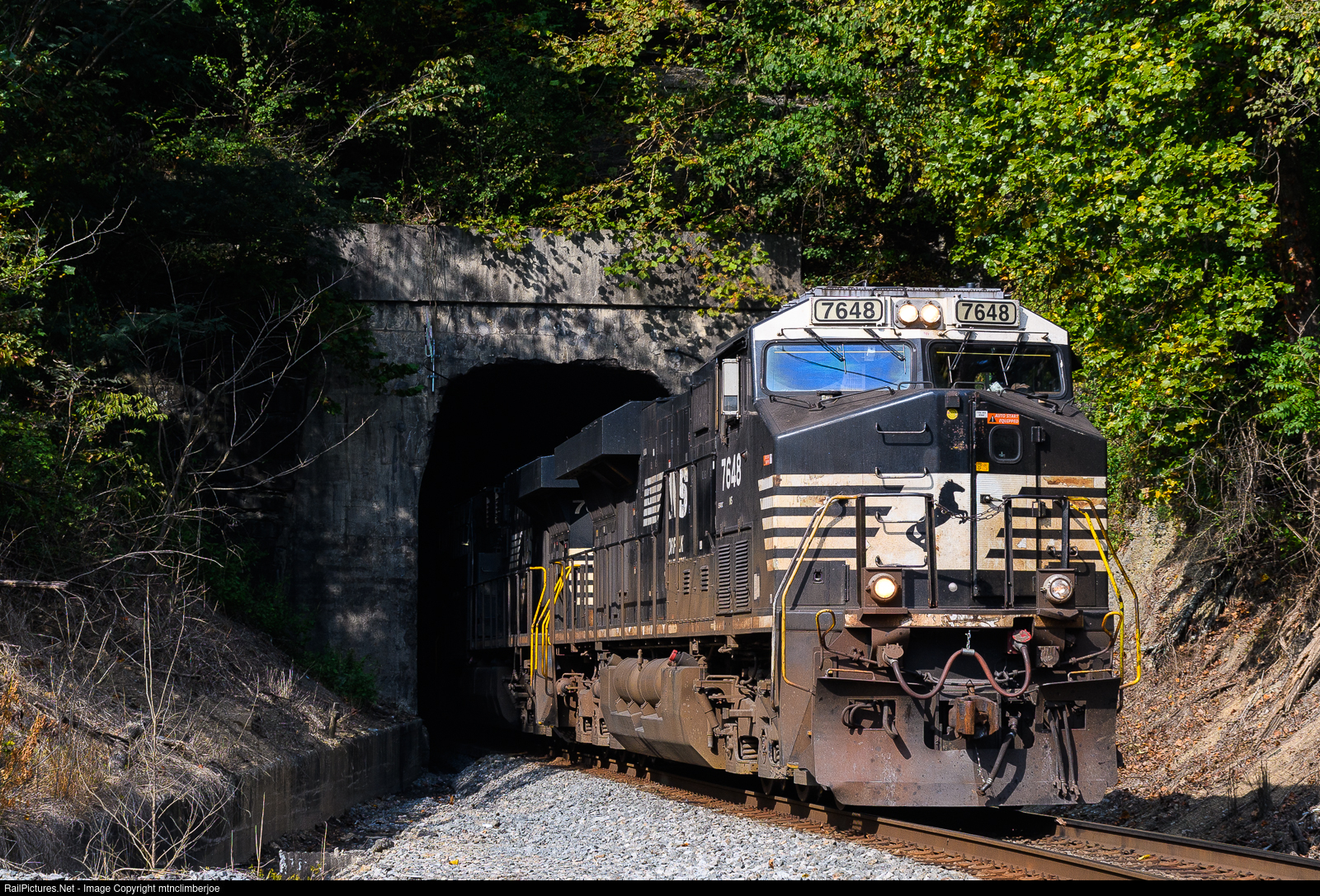 | A pair of GEVO's emerge from Tunnel 3 in Kermit, West Virginia as they lead an empty coal train east on the NS Kenova District. While the line once had seven tunnels along it route, three of them were bypassed when the line was cleared for double stack container clearances. |