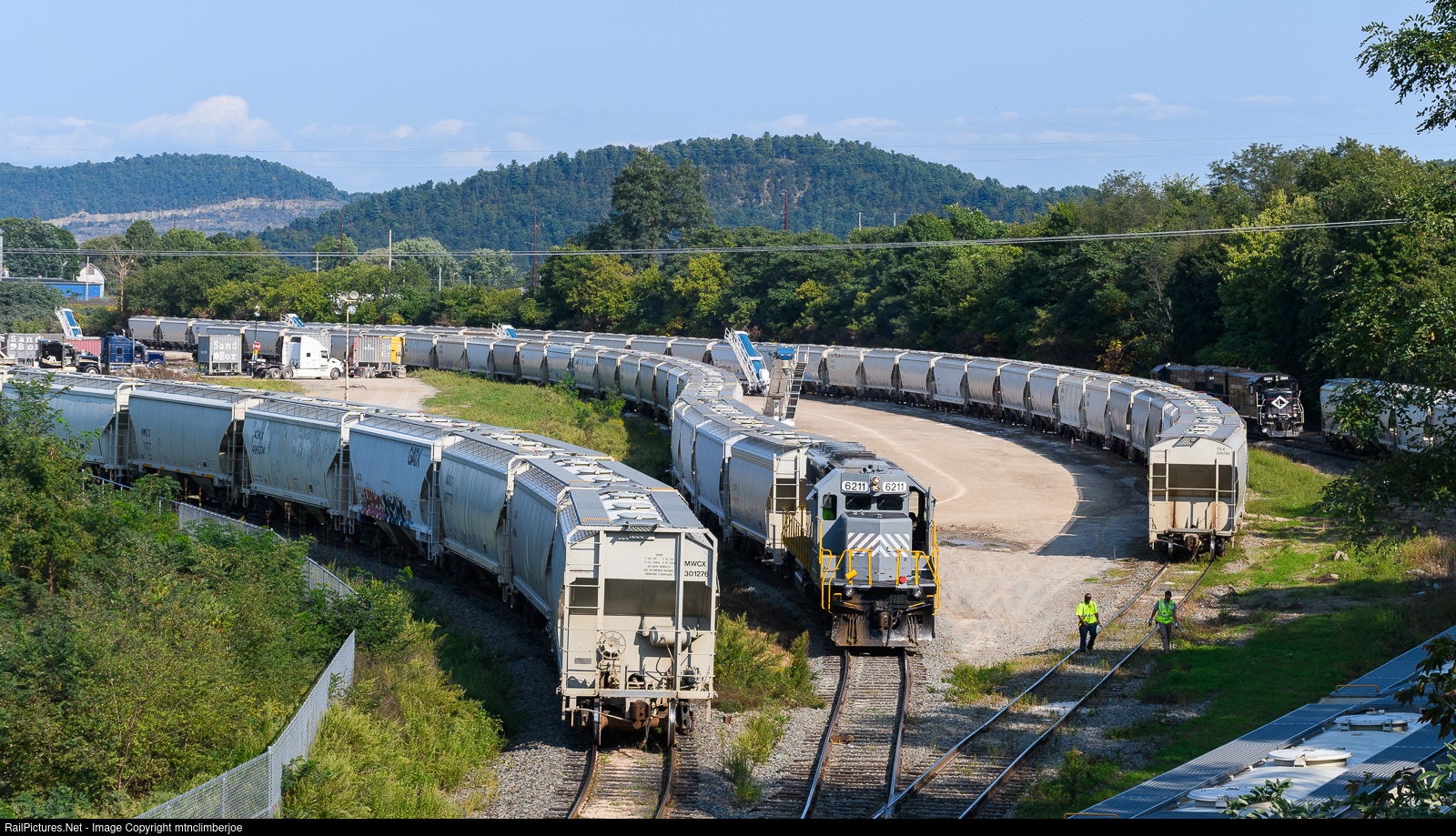 A pair of RJ Corman Lehigh Railway crews work the sand facility in Wysox, Pennsylvania on a Saturday afternoon, breaking down a unit sand train and spotting cars at the appropriate unloading locations. SD40-2 6211 is a recent arrival to the property, having been purchased from HLCX and patched for RJCC. The railroad's pair of U23B's can also be seen in the background, having just cut away from another string of cars waiting to be sorted.