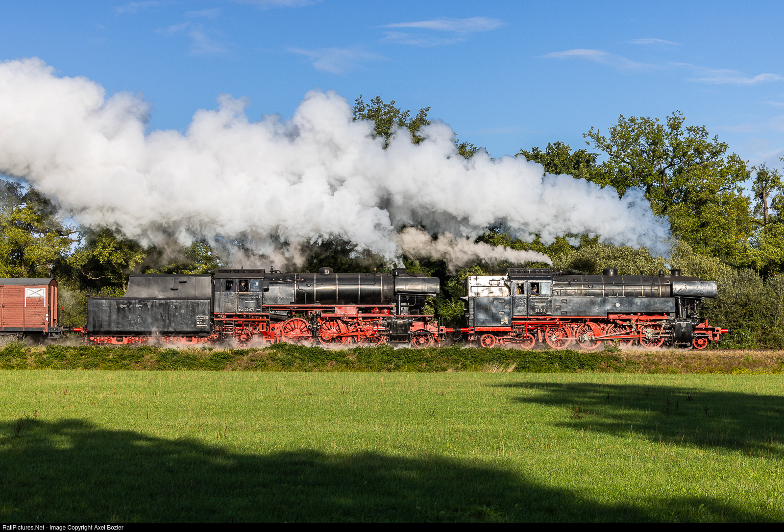 | Steam locomotives BR 65 #018 together with BR 23 #071 are pulling a photo freight train on the museum railway VSM (De Veluwsche Stoomtrein Maatschappij). BR 65 #018 is a "Neubau" 2-8-4 Tank engine that was built in 1956 for the Deutsche Bundesbahn DB by Krauss-Maffei in München-Allach. It had a short career in regular service, was already retired in 1973, went afterwards to the German steam locomotive museum (DDM - Deutsches Dampflokomotivmuseum) in Neuenmarkt. It has been owned by the Stoom Stichting Nederland since 1991 and is now running on the VSM on loan. BR 23 #071 is also a "Neubau" locomotive that was built in 1956 by Lokomotivfabrik Jung in Jungenthal for the Deutsche Bundesbahn. It was retired in 1978 and was sold to VSM in the Netherlands. |