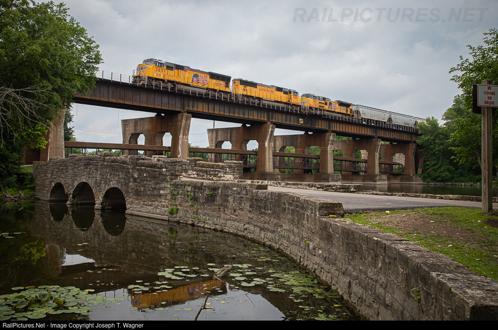 Multiple representations of the EMD SD70 series are seen here on display, making easy work of their short, 24-car LG2G2 16 local as the trio heads back toward home, sprinting east across the Fox River at Island Park in Geneva, IL along the former C&NW. This "new" transfer job, birthed from the on-going practice of PSR, peddles both intermodal and mixed freight tonnage between the yards at Global II/Proviso and Rochelle's Global III. Lifting the double-tracked rails of Union Pacific's Geneva Subdivision atop the calm waters below is this 102-year old, 486 foot deck plate girder bridge that also has a pedestrian walkway running beneath. A closer look reveals the old Chicago & NorthWestern herald still hanging on up top, serving as a subtle reminder to the now gone days of the old yellow and green.