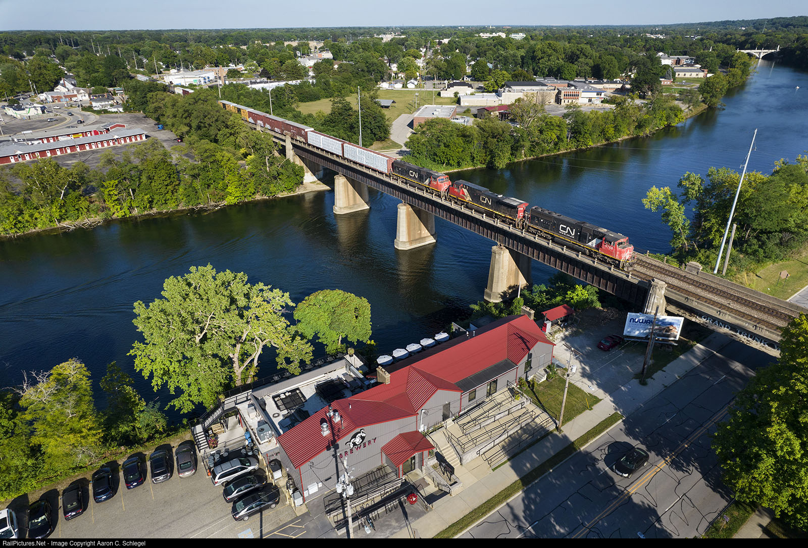 M 399 crosses the St. Joe River in South Bend. In the foreground is the Crooked Ewe Brewery. A great place to watch trains up close and enjoy the scenery.