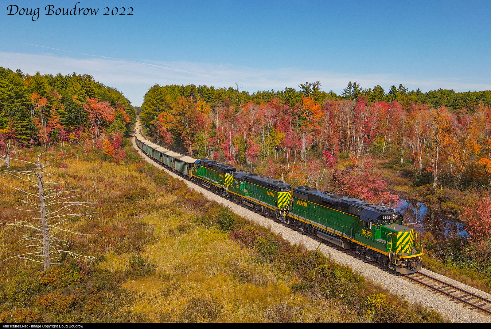 | New Hampshire Northcoast D8 was a little early out of the pit, departing before noon. The train is seen approaching Hutchins Crossing with 32 loads. Ten cars will be dropped off at Tri-City while the rest are destined for Boston Sand & Gravel. The fall foliage is popping out quite nicely along the old Boston & Maine Conway Branch. |