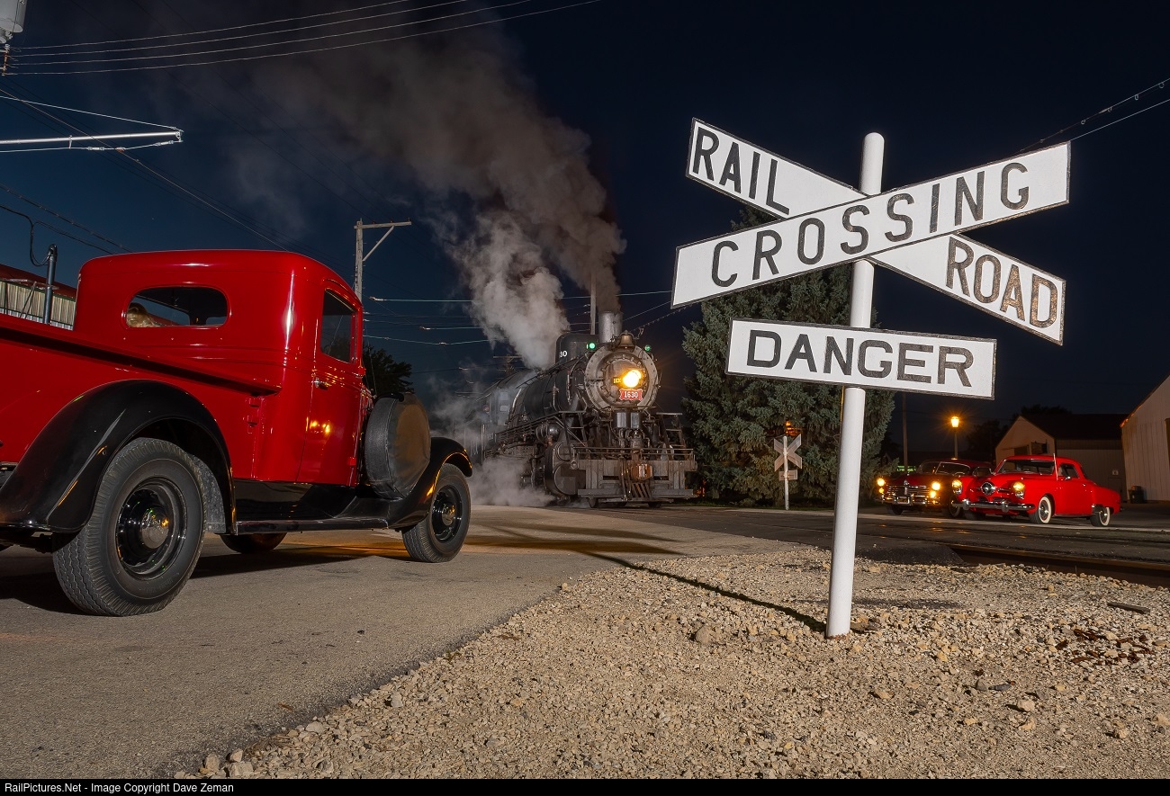 | Frisco 1630 holds up traffic at Depot Street at the Illinois Railway Museum during a nighttime photo shoot as it meets a '37 International, a '49 Hudson, and a '50 Studebaker. |