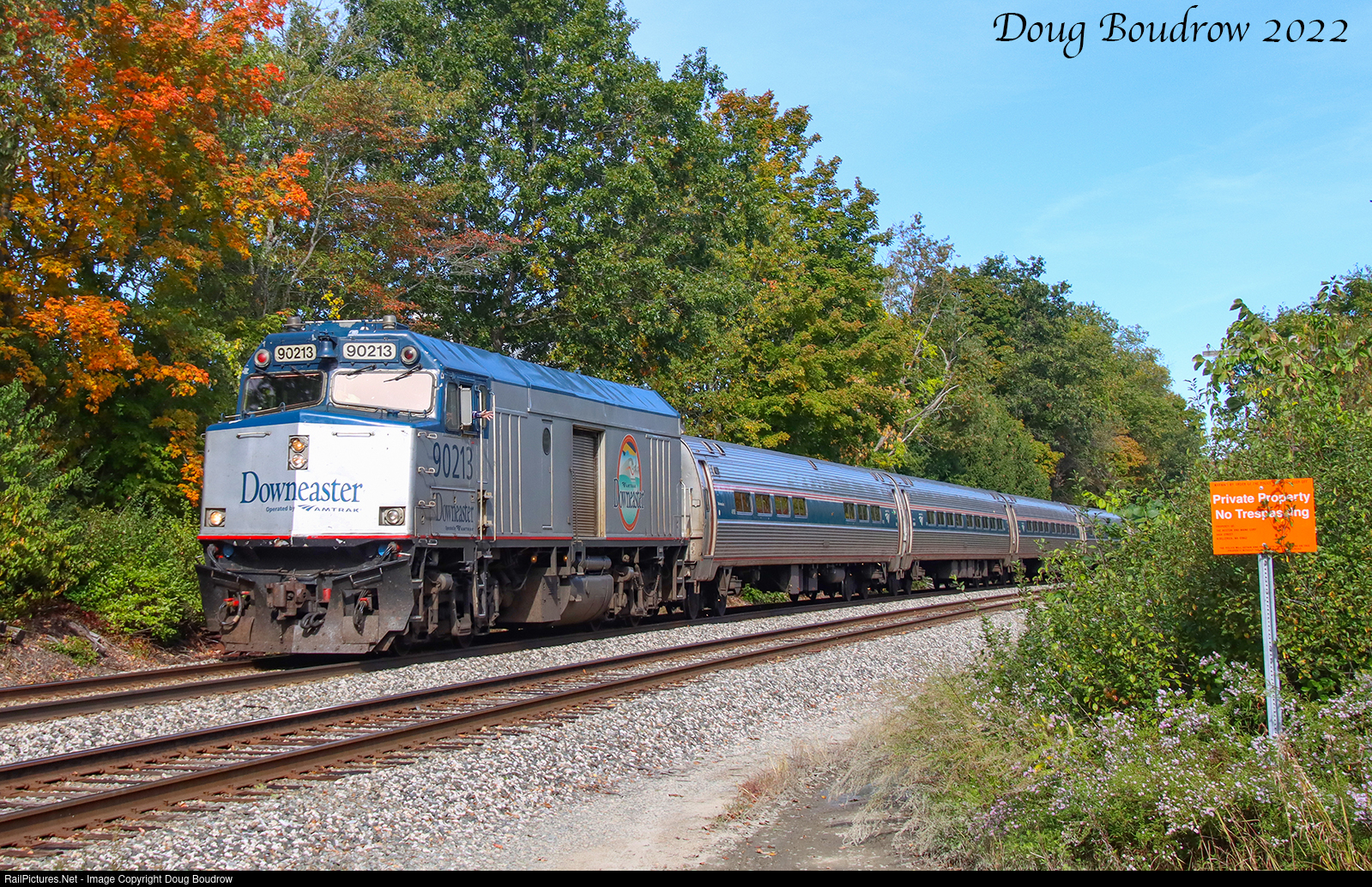 | Amtrak Brunswick to Boston Downeaster 686 is seen running a few minutes late into Dover, NH as they pass CPF-241 in Rollinsford. |