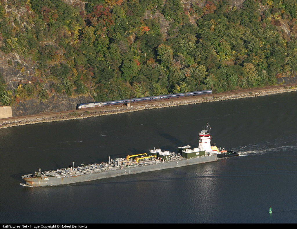Northbound Empire Service train #259 passes a tugboat pushing an oil barge up the Hudson River.