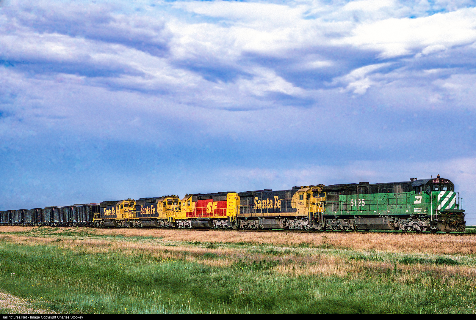 HEREFORD TX June 20 1986 — BN C30-7 5125 leads a loaded coal train in the Texas Panhandle on the Santa Fe's Transcon. My photo.