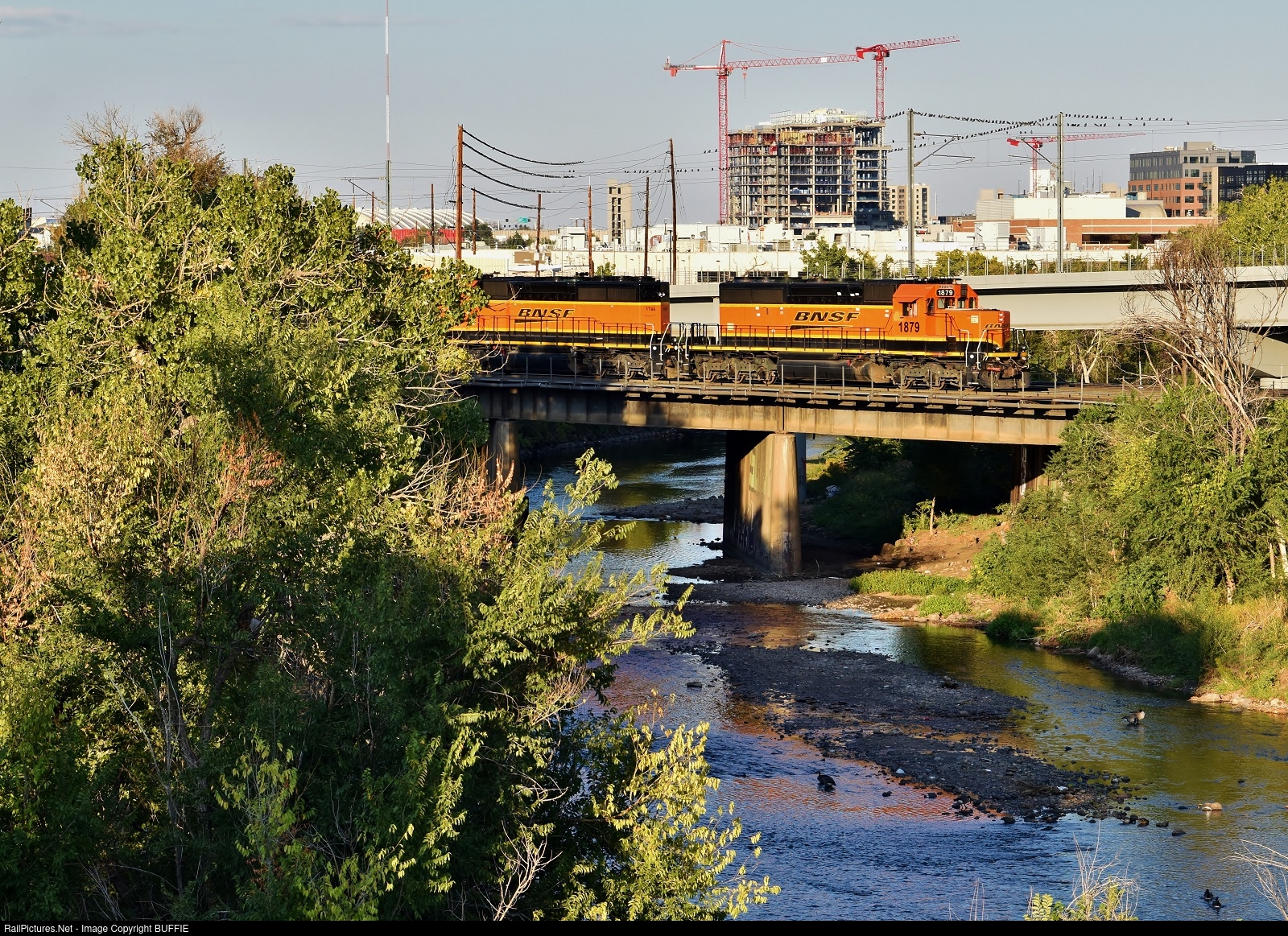 BNSF 1879 (SD39-2) crosses the South Platte River in downtown Denver, Colorado.