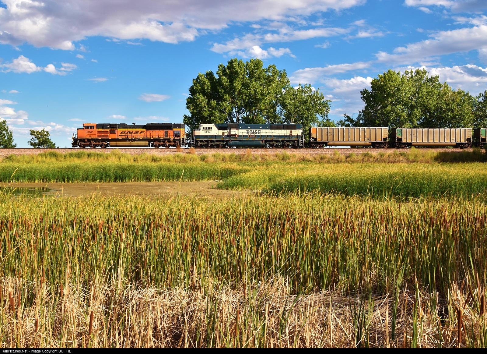 BNSF 9152 (SD70ACe) leads a coal train past the cattails at Barr Lake in Brighton, Colorado.