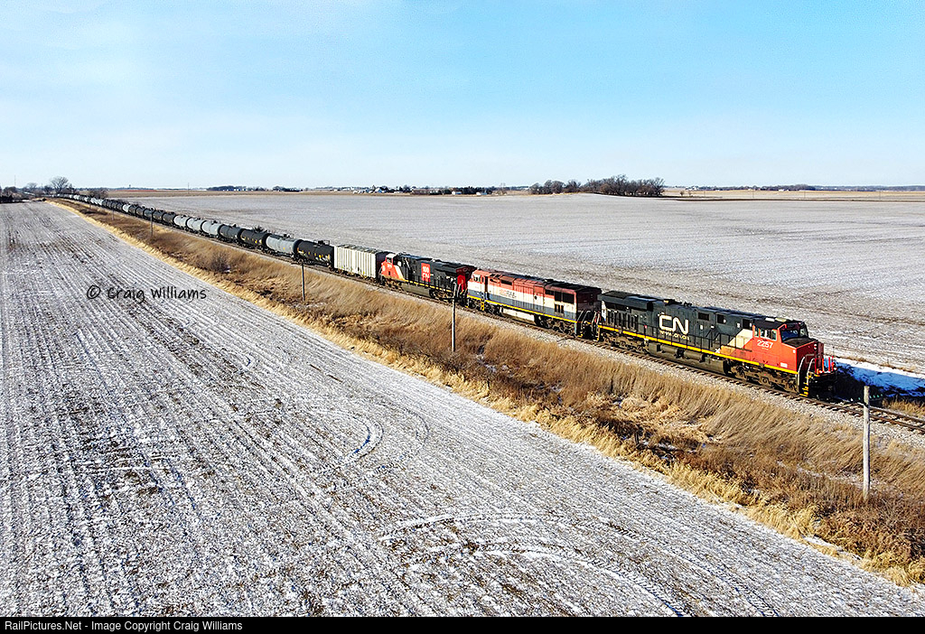 | On Christmas Even the CN got somewhat creative and ran a doubled up ethanol train instead of the normal 338 with Iowa freight traffic. The lack of people probably drove the decision? The train was setup 3x2 with 182 loads (100/82 car trains) and around 24,000 tons. Here the train is 18 miles into the trip towards Chicago as they pass the HBD at MP 257. Surprisingly couple BCOL barns are helping the cause. The 4602 here on the headend and 4618 in the DP consist back in 2020. |