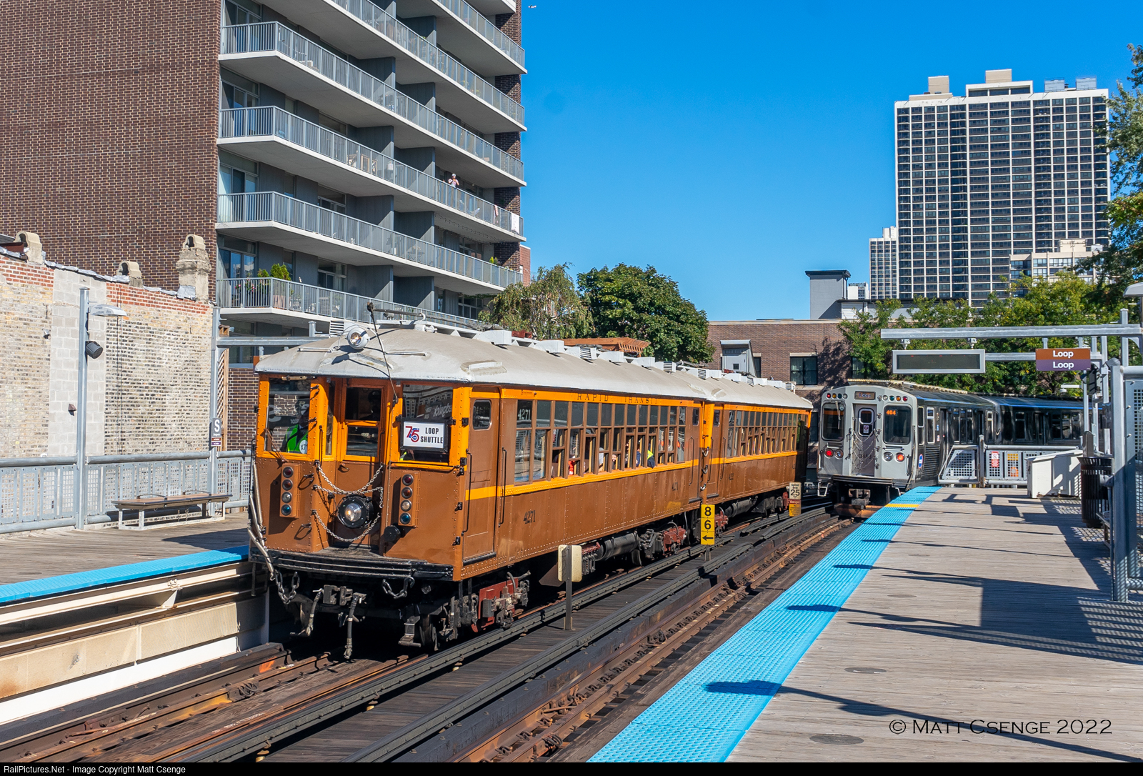 Chicago Transit Authority (CTA) car no. 4271 (Cincinnati Car Co., 1914-1924) is seen at Sedgwick Station en route to Skokie Shops after the CTA's 75th Anniversary celebration in the Loop. Passing in the other direction - and very nearly blocking this shot - is a Loop-bound Brown Line train, with former Skokie Swift car 3453 on the rear. Cars previously used for the Skokie Swift - now the Yellow Line - can be readily identified by the platforms in the roof where their pantographs we're previously mounted. |