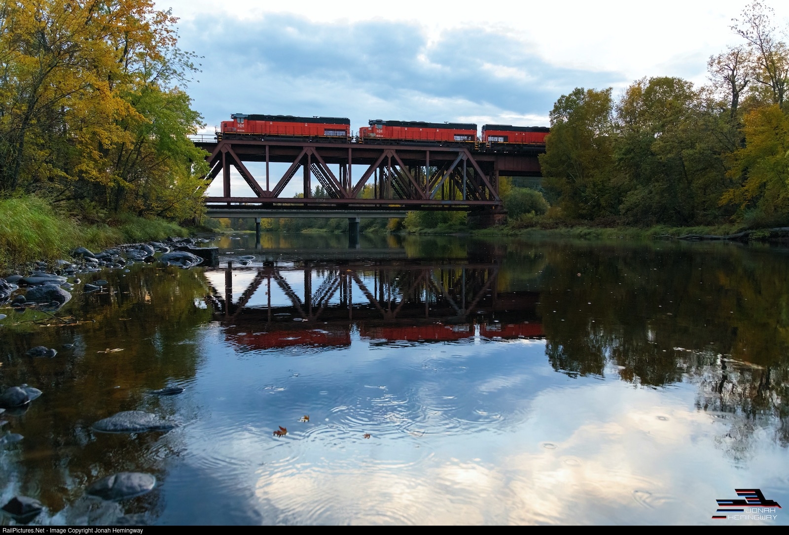 A trio of BLE Tunnel Motors take some limestone empties over the Cloquet River at Burnett.