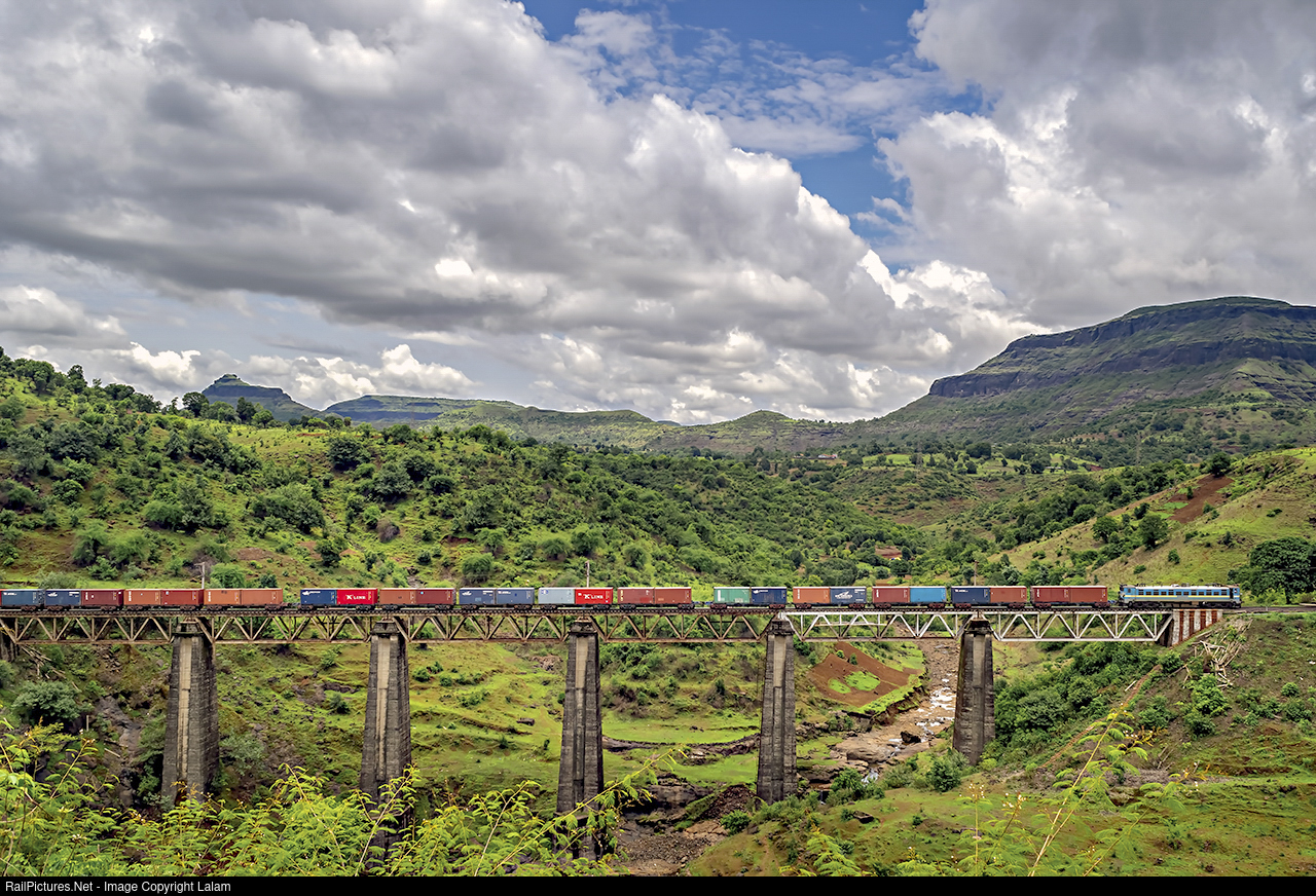 Goods train containing colorful containers, crosses Bheema-2 viaduct with lush greenery around.
