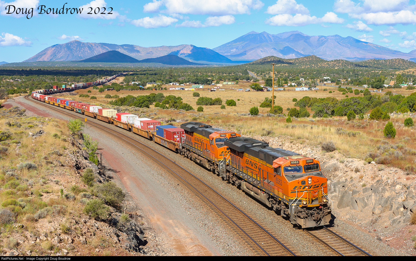 | One of the signature shots on the BNSF Seligman Subdivision is at Darling, just East of Flagstaff. Affectionally known as the "Darling Dip" morning Eastbound trains can be quite spectacular. |