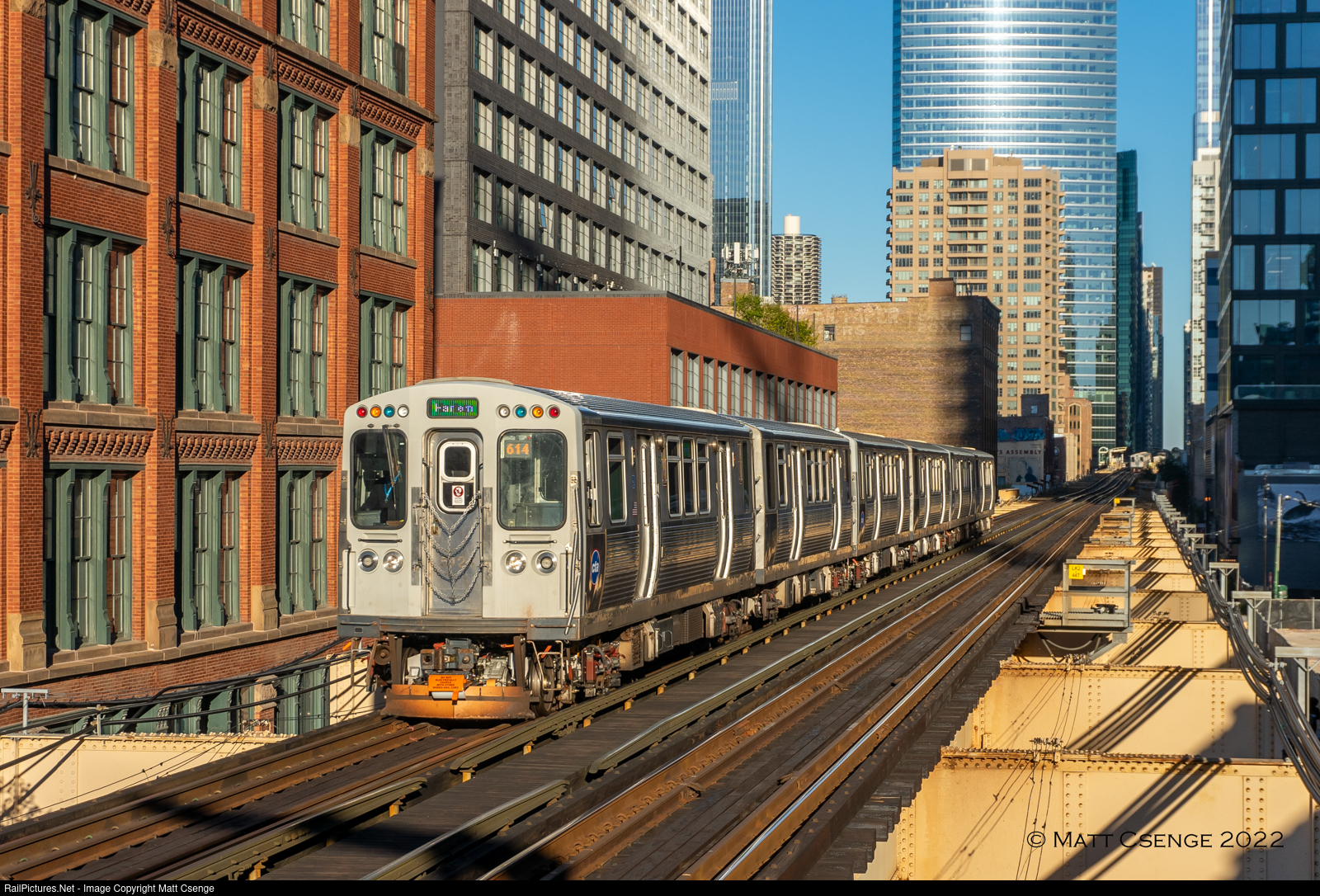Chicago Transit Authority (CTA) 5000-Series no. 5124 (Bombardier, 2009-2015) is the lead motor on Green Line run 614 as it races through the West Loop neighborhood towards Morgan Station.