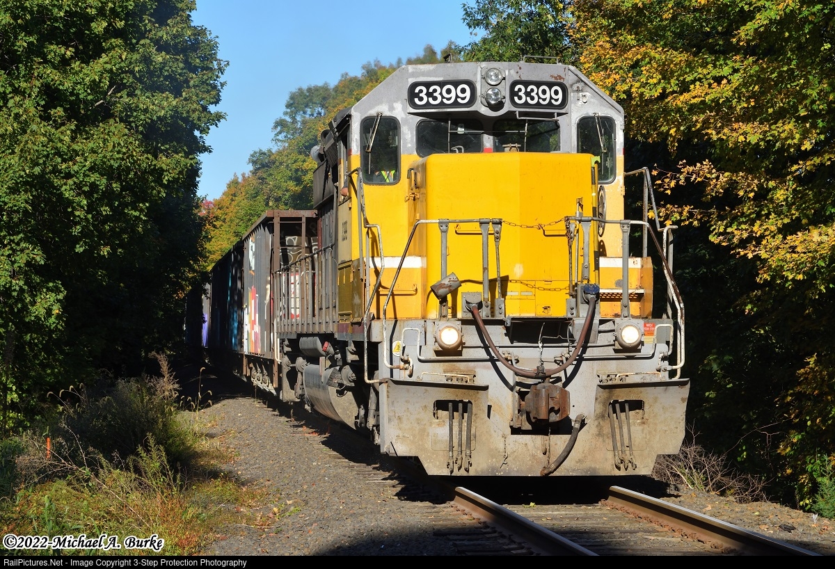 Providence & Worcester train CT-1 with Connecticut Southern SD40-2 3399 crawls uphill towards Williams Road in Wallingford. What may seem like a normal train picture has a story to go along with it. There are around 40 loaded stone hoppers behind the SD40-2 and a single C40-8 on the rear. The grade leaving Tilcons Reeds Gap Quarry, on the Middletown Main (former New Haven Railroad Air Line) is steep, especially with a heavy train, wet rails, or in this case, aging and inefficient power. After stalling multiple times attempting to make the hill, the crew of CT-1 shoved back to clear Williams Road and wait for further help.