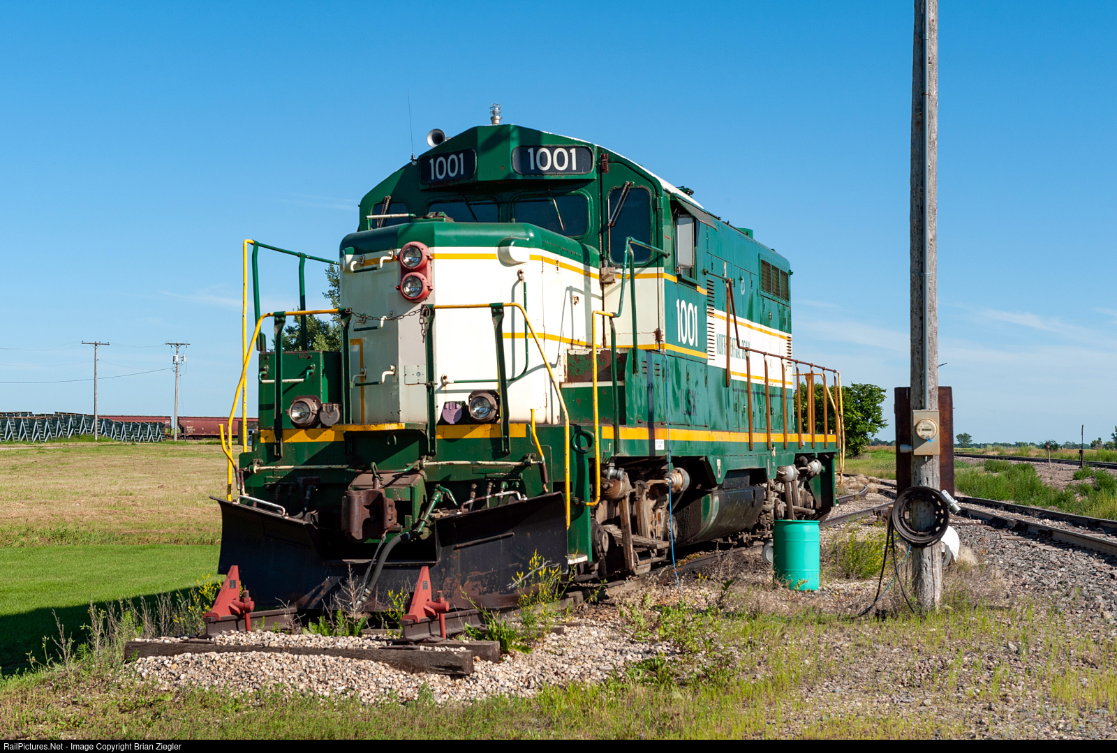 | North Central Grain's GP10 locomotive ILSX 1001 rests on the stub track at Bisbee ND. This unit has quite a colorful past operating in MS, WA and all across the IC back in the day. With a BNSF shuttle train and 3 big motors pulling in on the loop track for loading in the background, one wonders if this unit gets used very much. |