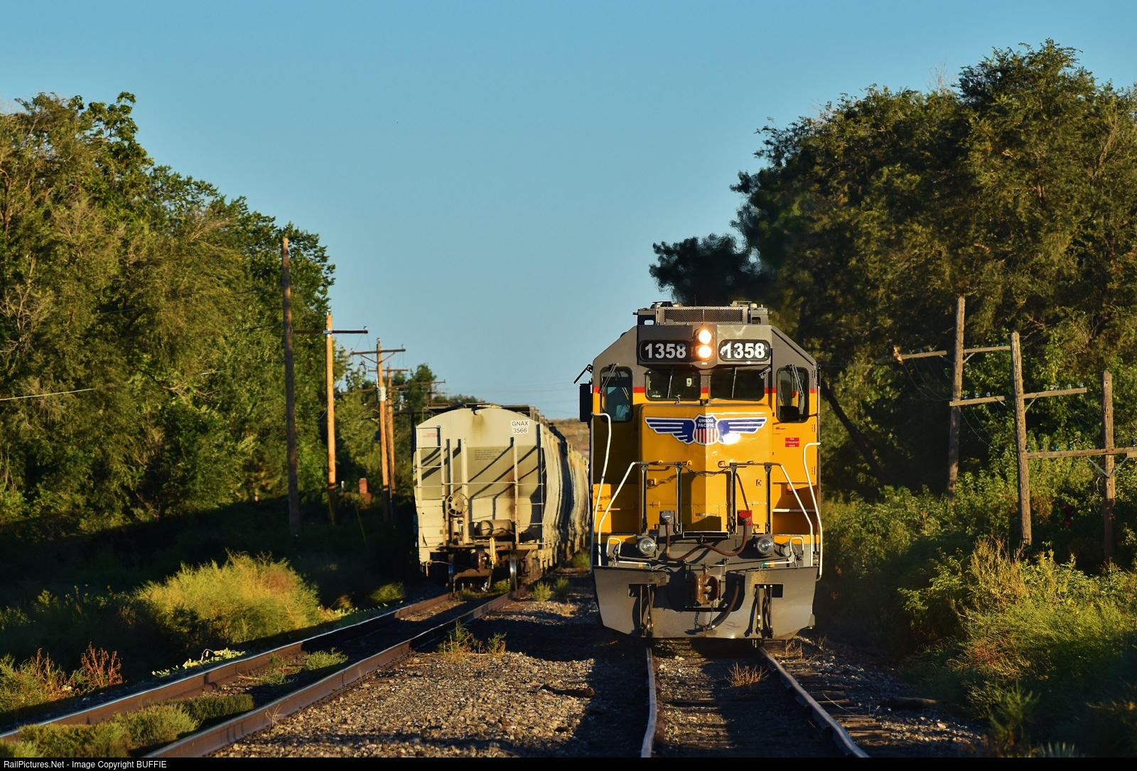 UP 1358 (GP40N) has just dropped off a cut of hoppers and heads back to the yard in Florence, Colorado.