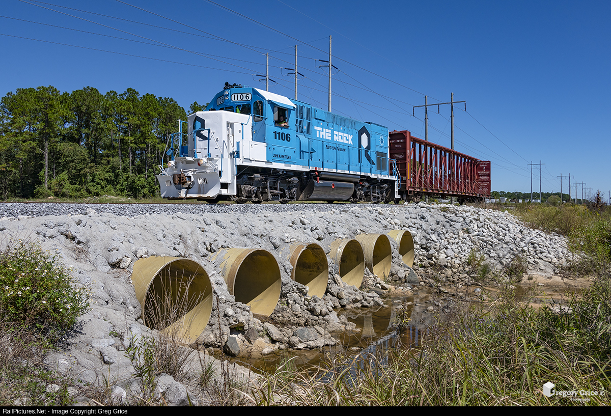 On September 29th, 2022, Rock Island Rail's Gulfport Local, with GP15-1 1106, traverses over a repaired washout area on newly acquired Gulf & Ship Island Railroad trackage along Seaway Road in Gulfport, MS. This area, along with the wooden bridge over the Bayou Bernard waterway just down the tracks, were two obstacles that caused KCS to abandon service on the line, resulting in the Rock Island take over.