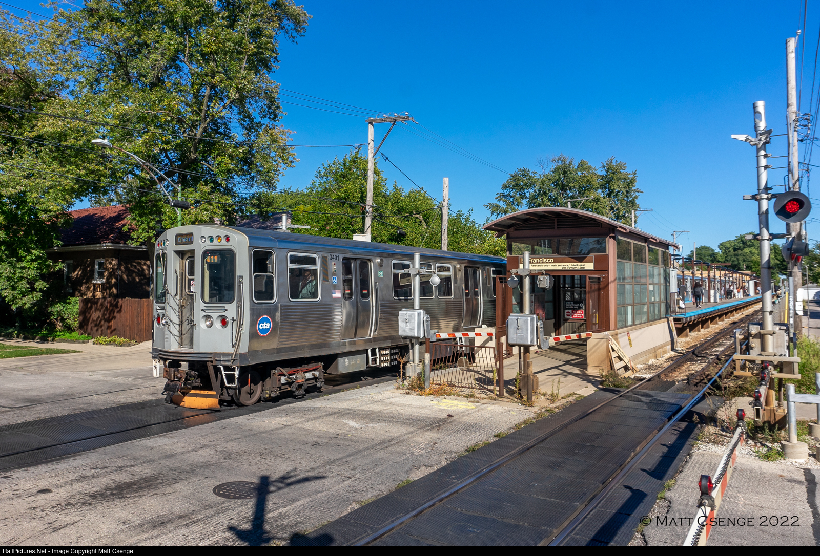 Chicago Transit Authority (CTA) 3200-Series no. 3401 (Morrison-Knudsen, 1992-1994) is seen departing Francisco Station en-route to Kimball. Between Rockwell and Kimball, the Brown Line features a number of grade crossings, a feature that is unique for rapid transit systems in the United States.