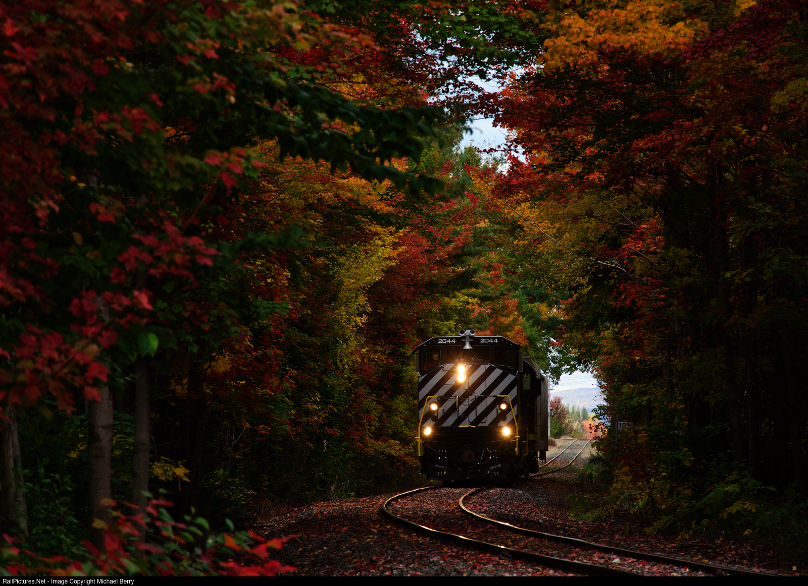 Fall colours are at their peak as the Sartigan Railway heads south on this ex-Quebec Central line with a single car in tow and an ex-BCOL M420W leading.