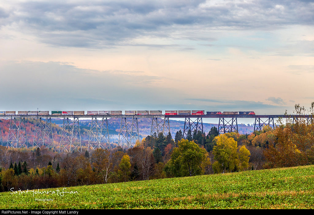 | CN train 121 crosses the 3,920 foot Salmon Trestle, south of Grand Falls, New Brunswick. |