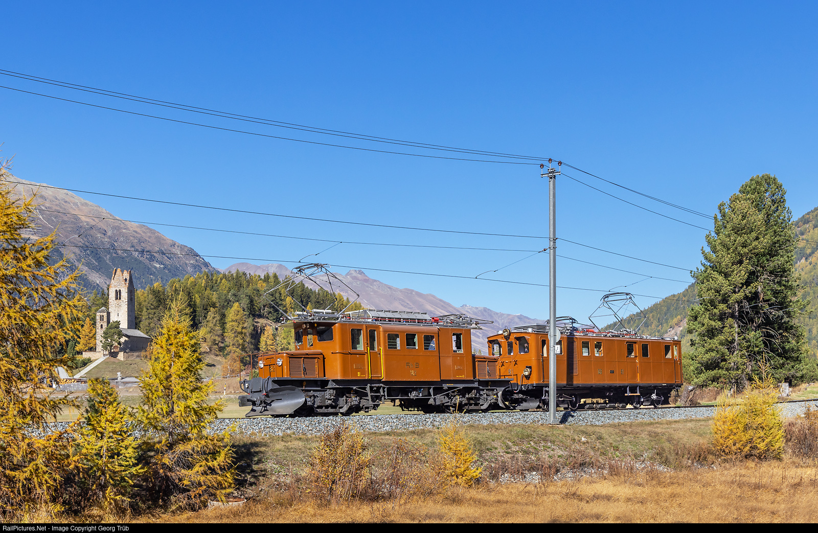 "Bernina Crocodile" Ge 4/4 # 182 of the Rhaetian Railway, built in 1927 for the Bernina Railway, and former Bernina Railway locomotive Ge 4/4 # 81, built in 1916, now owned and operated by the Blonay-Chamby Railroad museum but as guest on the old home rails, are running from Pontresina to St.Moritz, passing the San Gian church from the 15th century near Celerina Staz.