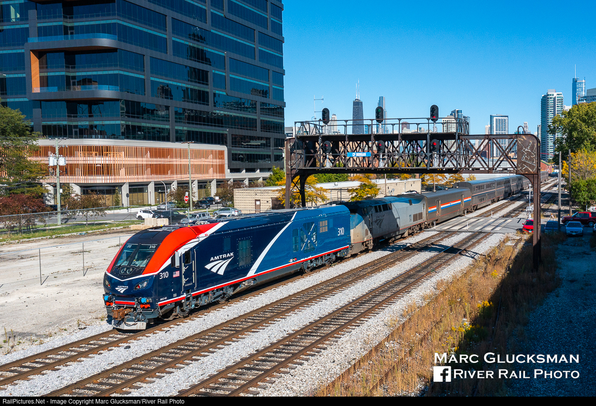 Train 7, Phase 7. On the afternoon October 3, 2022, the Amtrak Empire Builder departed Chicago Union Station with AMTK 310 (Phase VII, ALC-42, Siemens) leading AMTK 11 (Phase V, P42DC, GE) and a 9-car train through CP Morgan neat North Racine Avenue in Chicago, Illinois with the Sears (some call it Willis) Tower in the background. The ALC42s have been making their way into the pool for the Chicago based long distance runs, and this mixed power may be a common sight for the near future. In Spokane, Washington, the train will split in two and one engine will lead to Seattle, Washington while the other part goes to Portland, Oregon.