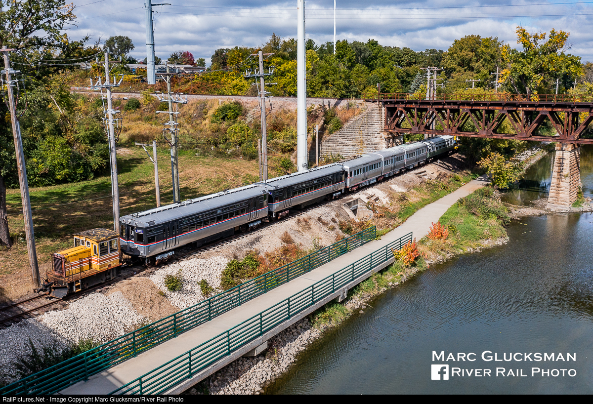 Long Train. For the first time in many years, the Fox River Trolley Museum in South Elgin, Illinois held a “Photographer’s Day” on October 2, 2022. The event was held in the early morning to catch the best light on the line and highlighted all of the recent restoration work by the museum’s shop. It was timed to coincide with the 75th Anniversary of the Chicago Transit Authority on October 1, 2022. The crew made up a 7-car train of CTA equipment bracketed by 2 CTA engines (S-MS65-40-43-5001-45-S314-L202-N) and used CTA 4451 as transportation for the attendees, breaking the train to make “combo shots” on the line. At the end of the morning, the whole 7 car train was posed under the Canadian National Railway bridge over the Fox River near Stearns Road for a grande finale.