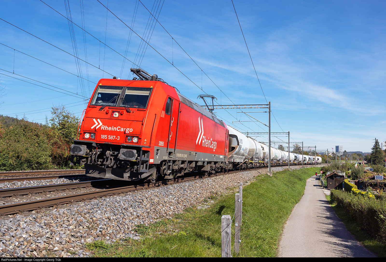 | Bombardier TRAXX F140 AC2 185 # 587 of the Akiem leasing company, rented to Rhein Cargo, is pulling the empty VTG ciment tank car train 48086 from Heerbrugg via Winterthur-Kloten-Regensdorf-Bözberg-Basel to Deuna/Germany, between Winterthur and Winterthur Tössmühle. |