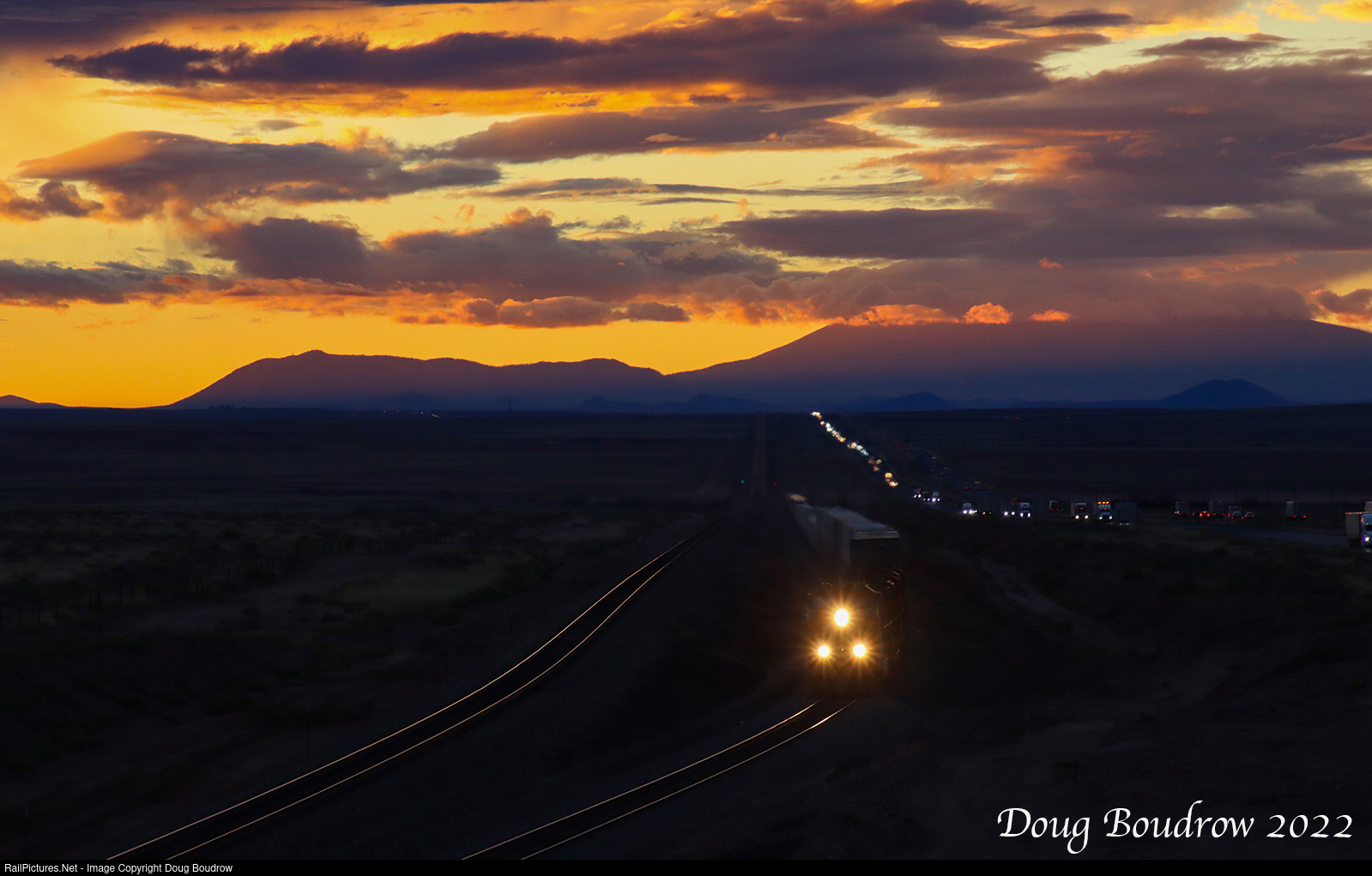 Coming across the dark desert running along I-40, another stack train is seen headed East into Winslow for a crew change. This line sees close to 90 freight trains a day, but we were happy one of them came during this spectacular Arizona sunset.