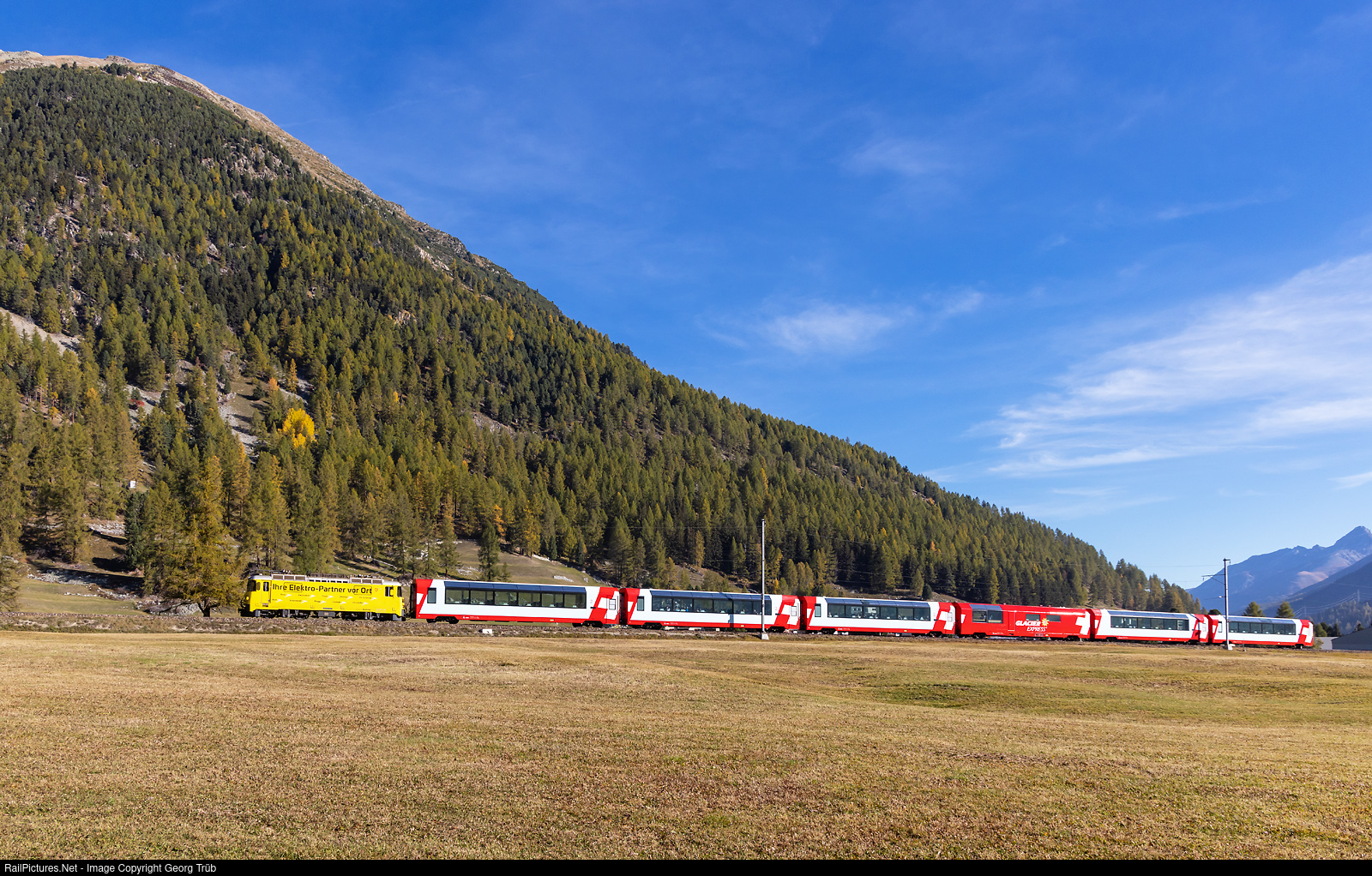 | Ge 4/4 II # 612 of the Rhaetian Railway, in the publicity paint scheme for the Burkhalter group, is pulling the PE 905 GLACIER EXPRESS from St.Moritz to Zermatt, between Bever and Spinas. |