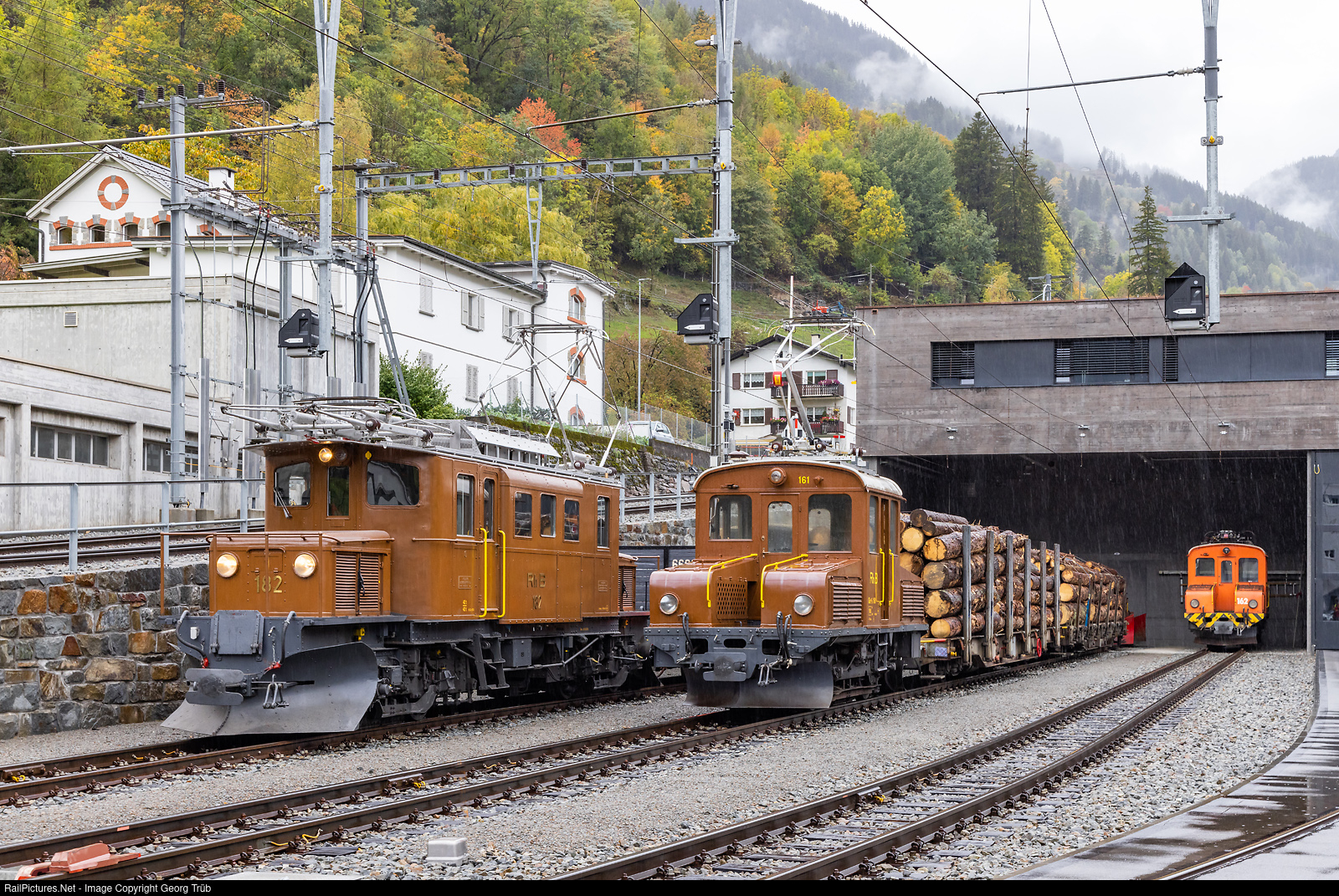Random "line-up" in Poschiavo in front of the new infrastructure building, from left to right: "Bernina Crocodile" Ge 4/4 # 182 built in 1927 by SLM and SAAS for the then independent Bernina Railway, with a photo freight train with historic cars renovated by the "Club 1889". "Asnin" (donkey) Ge 2/2 # 161, built in 1911 by SIG and Alioth for the Bernina Railway, mainly as trailing locomotive for heavy trains, nowadays used as shunter in Poschiavo in daily service. And the sister "Asnin" in orange color, Ge 2/2 # 162, built in 1911 for the Bernina Railway, used as backup for the # 161.