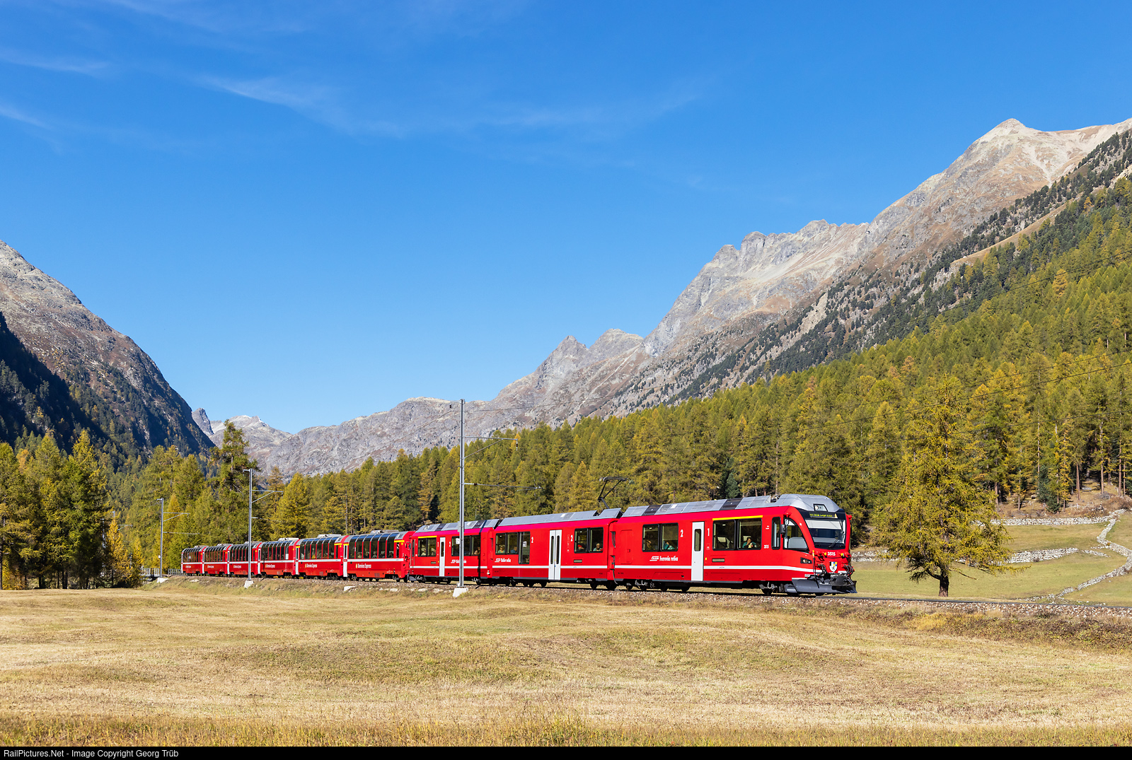 | "Allegra" ABe 8/12 # 3515 of the Rhaetian Railway is pulling the PE (Panorama Express) 951 BERNINA EXPRESS from Chur over the Albula and Bernina line to Tirano, between Spinas and Bever. |