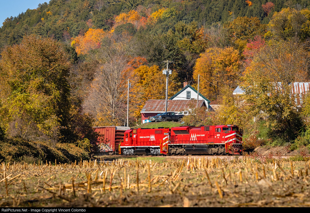| VTR 431 and freshly-painted 201 lead Green Mountain Railroad train 263 east at Missing Link Road in Chester, VT. The train passes a harvested corn field on its journey from Rutland to Rockingham. |