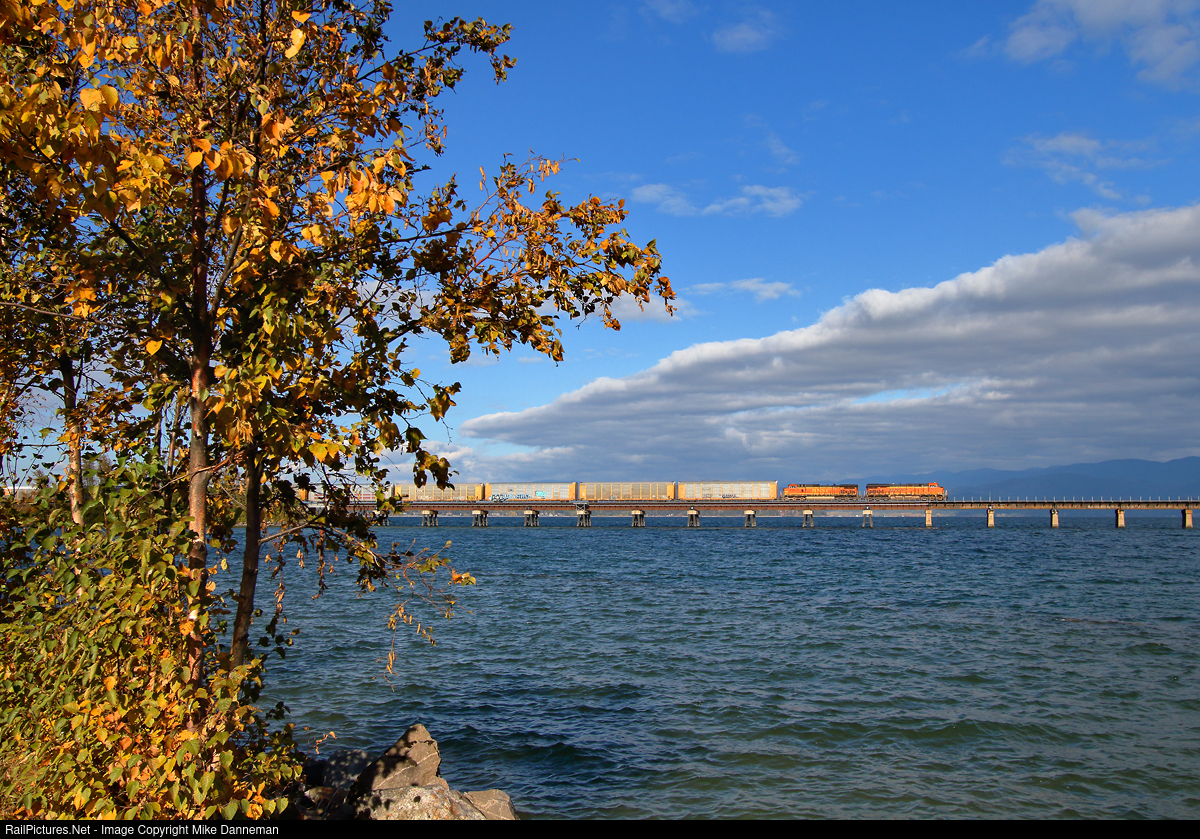 A westbound BNSF vehicle train crosses the long bridge over Lake Pend Oreille as it departs Sandpoint, Idaho, on the afternoon of October 6, 2018.