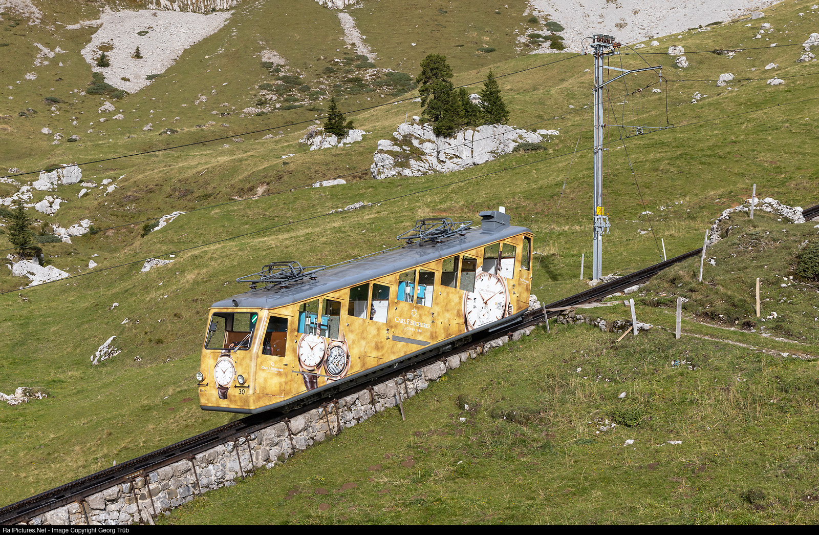 | Cogwheel railcar Bhe 1/2 # 30 of the Pilatus Bahn with publicity paint scheme for Carl F. Bucherer watchmaker was built in 1967 and will be withdrawn soon. Running down from Pilatus Kulm to Alpnachstad on the Mattalp as part of train 10. The green schield with white stripe in the cab signals that another (or more) railcars are following on sight distance. There are no passengers, but material of the hotel/restaurant on Pilatus Kulm loaded. This railcar has two doors on two compartments that open up the entire width of the compartment so that rolling containers can be loaded. The seats can be folded up for this purpose. |