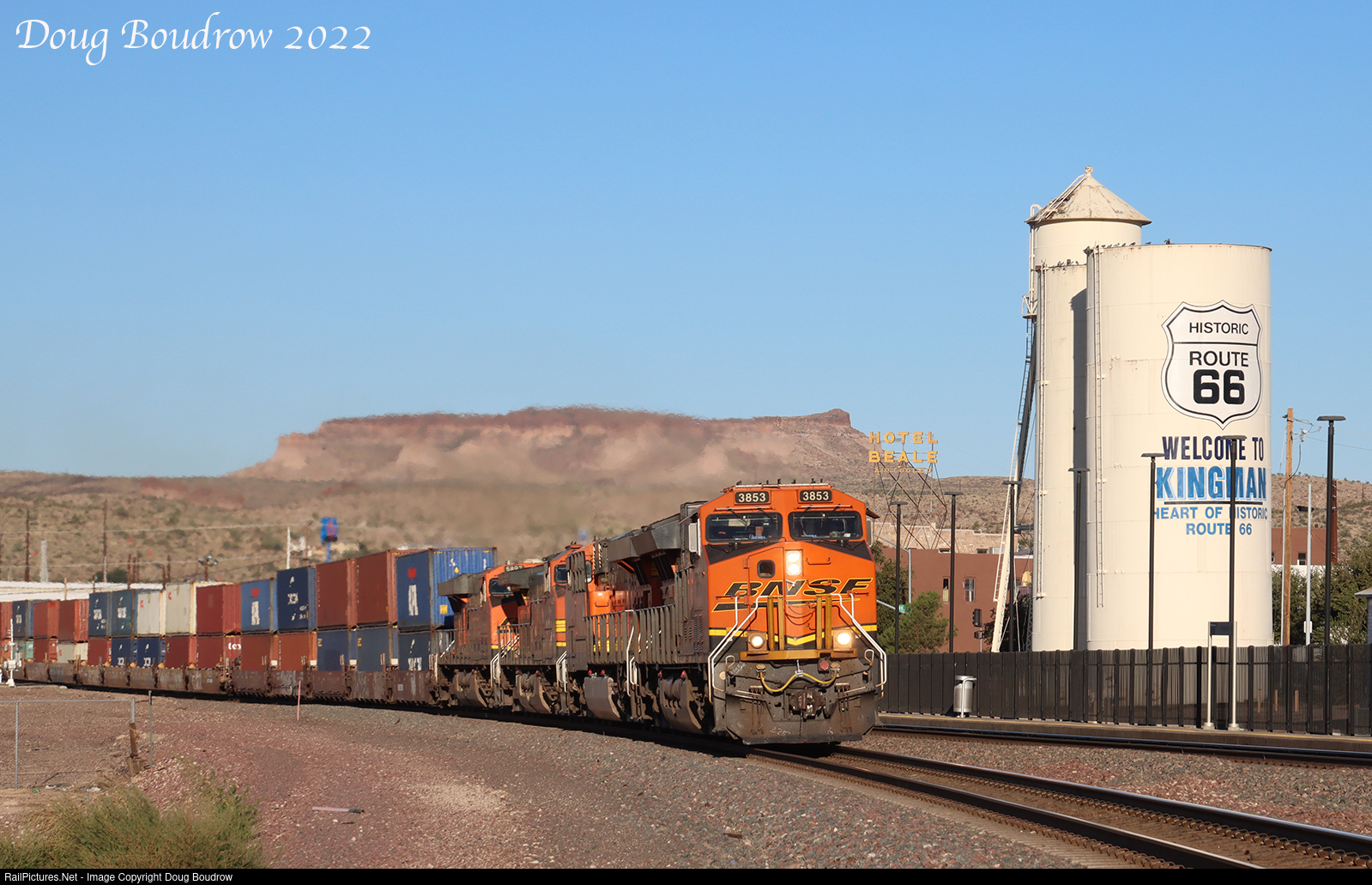 BNSF 3853 East is seen passing through Downtown Kingman, Arizona with a priority intermodal train. The Route 66 water tower is a famous landmark and the town refers to itself as "The Heart Of Route 66."