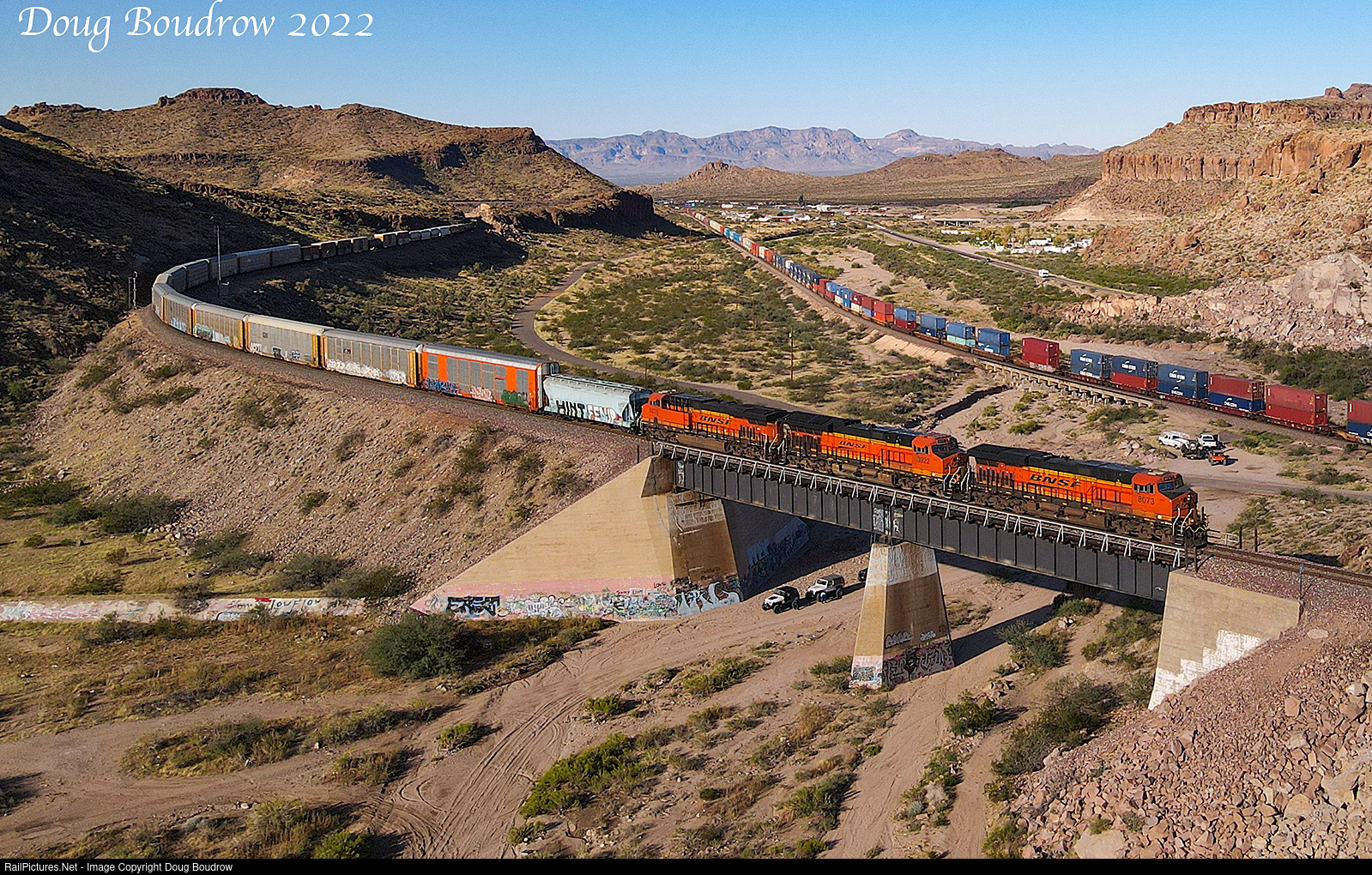 BNSF 8038 East winds through Kingman Canyon with an autorack train as a double-stack train heads West on the lower main. A group of off-roaders is preparing their Jeeps for a day on the trails.