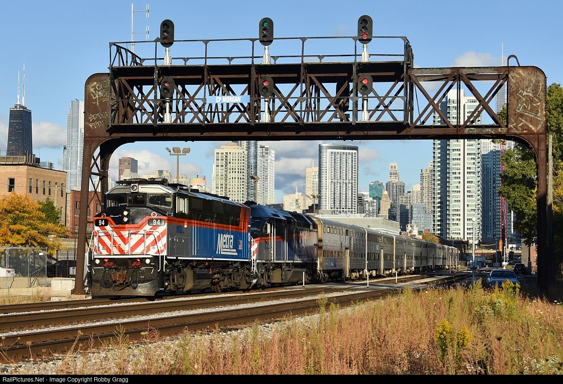 Metra 94 leads a outbound train out of the city, passing CP Morgan.