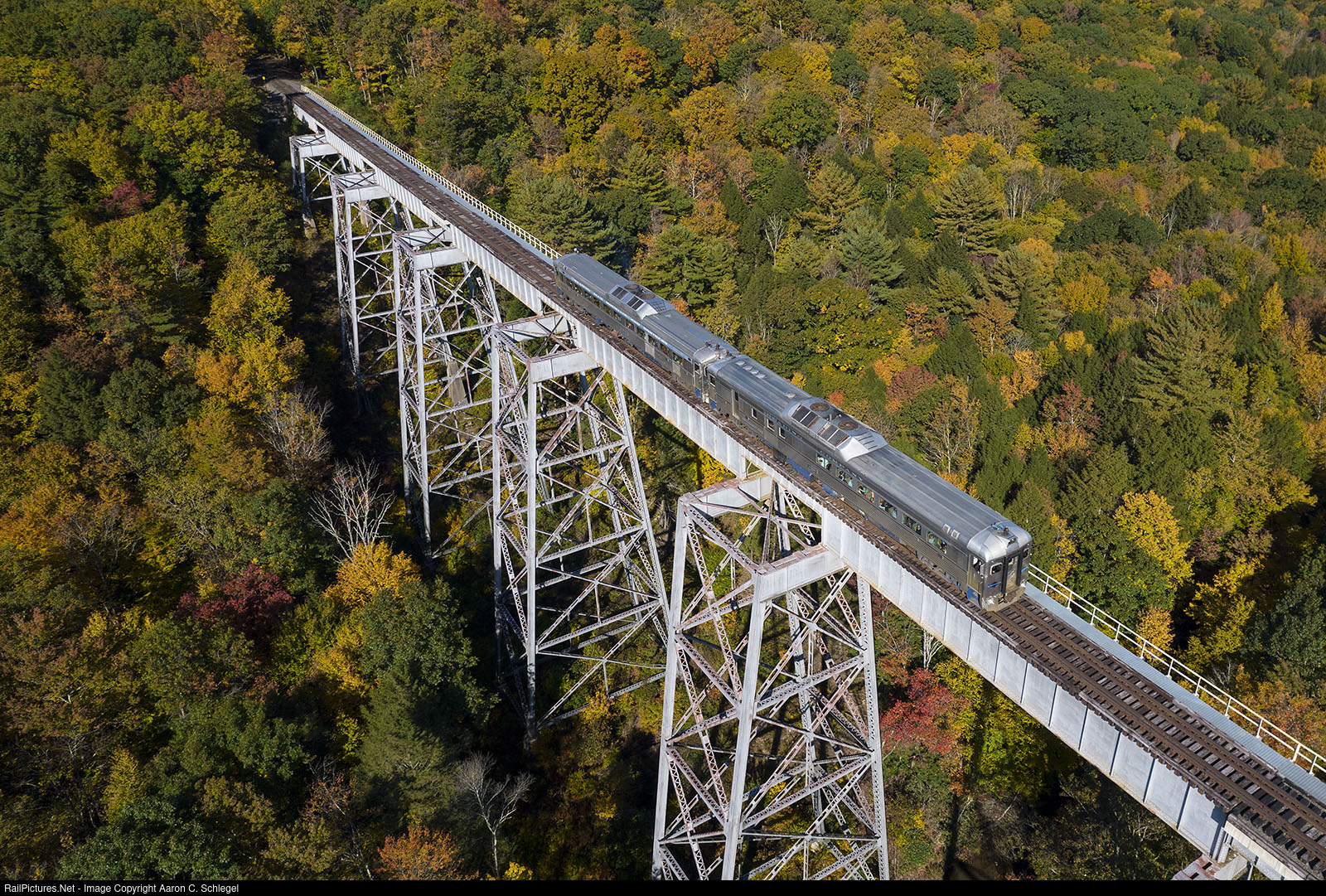 As part of the Reading & Northern Autumn Leaf Excursions the Rail Diesel Cars are used for the Pottsville to Jim Thorpe and return trips. Here RDC-3, EX Boston & Main 6305, Now RBMN 9166 leads the RDC-1, RBMN 9168 across the Hometown Trestle in Hometown, PA. Just a week later the Leaves will be in full effect.