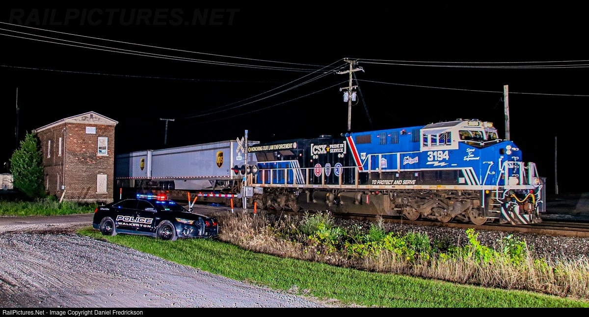 CSXT 3194, the "Spirit of Our Law Enforcement" locomotive, blasts past the former B&O tower in Walkerton, IN leading Q017 for Bedford Park, IL, the night before our great nation celebrates its birthday! Special thanks to the Walkerton PD for posing one of their squad cars (complete with lights!) for the shot.