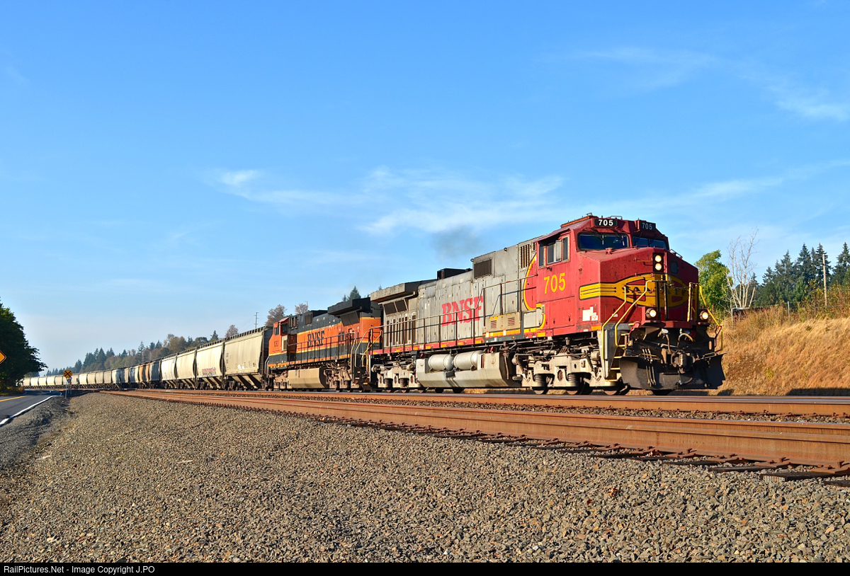 | Two BNSF heritage Dash 9's power a loaded grain train. The trailing units on the back included BNSF 625, a very fainted warbonnet. Follow me on instagram @j.po_railphotos for more photos and videos! |