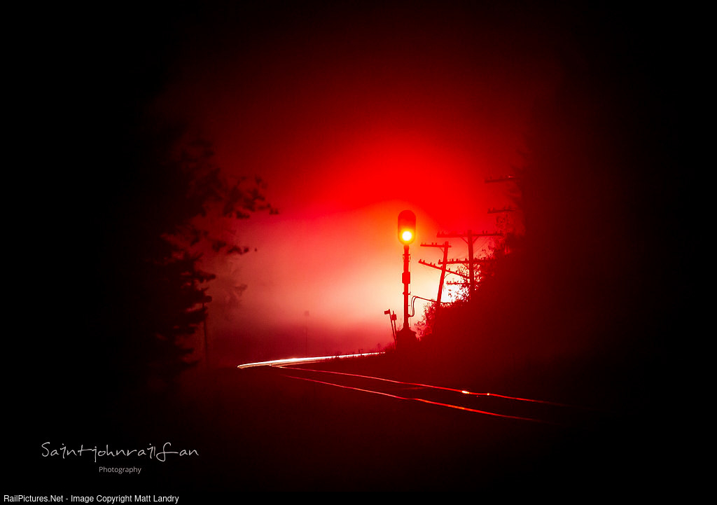 The red eastward facing signal illuminates the air as the headlights of train 306 comes into view, rounding the bend approaching Edmundston, New Brunswick.
