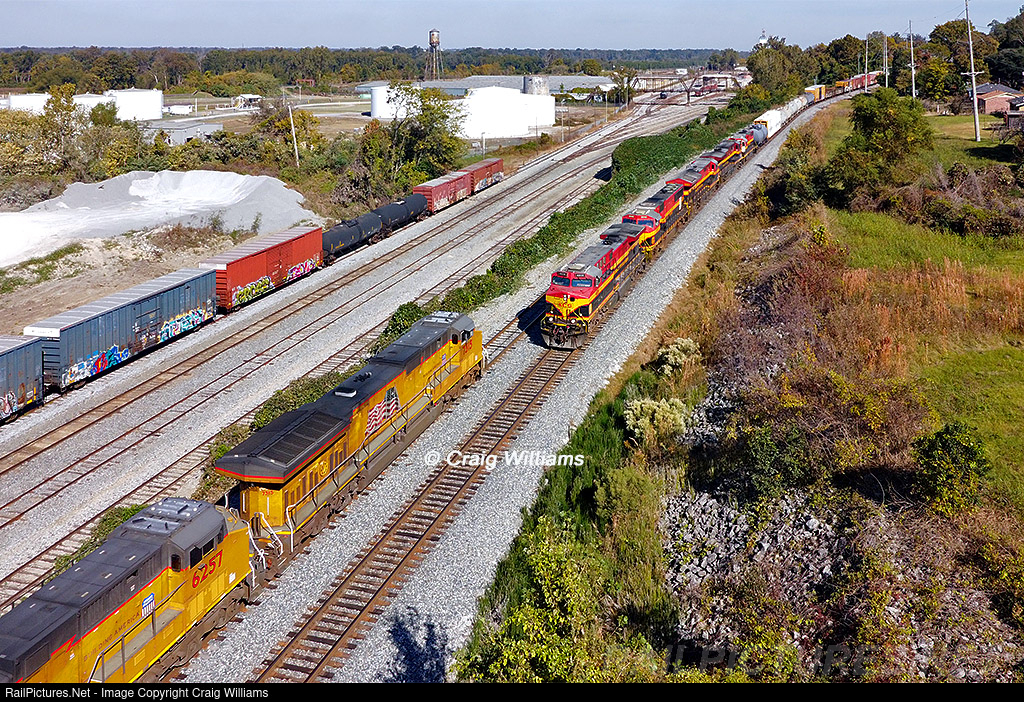 | The UP run thru Z-train (IZLCAI) from Los Angles to Atlanta that the KCS handles between Shreveport and Meridian, slowly pulls into the siding at Vicksburg. The train is meeting this massive 12,000 foot MARSH-09 coming west. To the left of the trains is the Vicksburg Southern's yard. These 2 trains seem to be daily daylight trains in this area the 4 days we were here in 2021. |