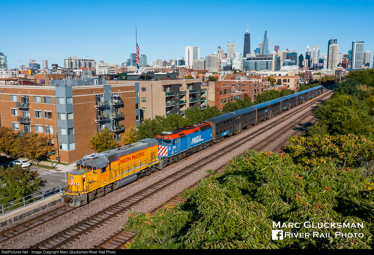 Box Capped By A Geep. On Monday, October 3, 2022, Union Pacific Railroad GP15AC UPY 729 (ex-MP 1729, EMD, 12/1982) was brought out to tow Metra METX 156 (Village of Barrington, 4/1983) and a six-car consist from the Ogilvie Transportation Center. Seen near North Racine Avenue in Chicgao, Illinois, the train is heading towards the yard. The Union Pacific still plays a significant role in Chicago area commuter operations, the only place in the country that UP has such an arrangement with a passenger agency.