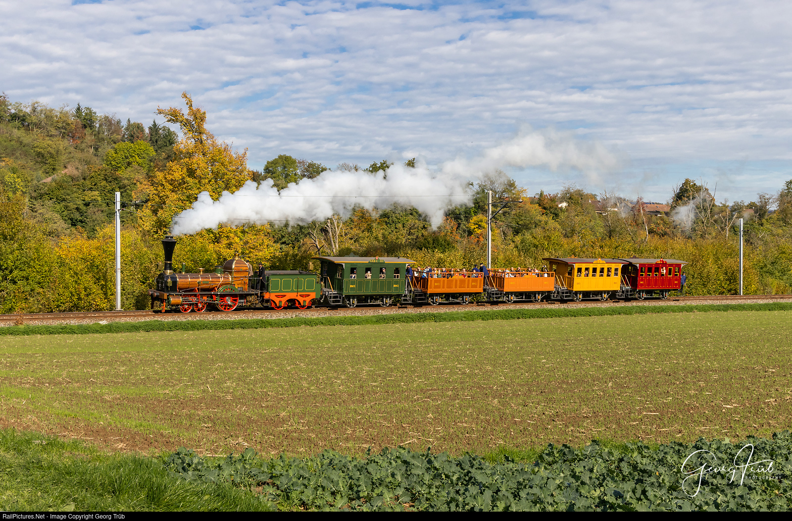 Steamlocomotive D 1/3 # 1 "Limmat", a replica built 1947 of the very first steamlocomotive in Switzerland, built in 1847 by Emil Kessler in Karlsruhe/Germany for the Schweizerische Nordbahn (SNB) from Baden to Zürich, with the cars of the "Spanisch-Brötli-Bahn", which was the nickname of this first swiss railway. The train run from Koblenz to Laufenburg along the Rhine river and is between Schwaderloch and Etzgen. Just behind the bushes is the Rhine and the border to Germany. The houses in the background are in Albbruck/Germany.