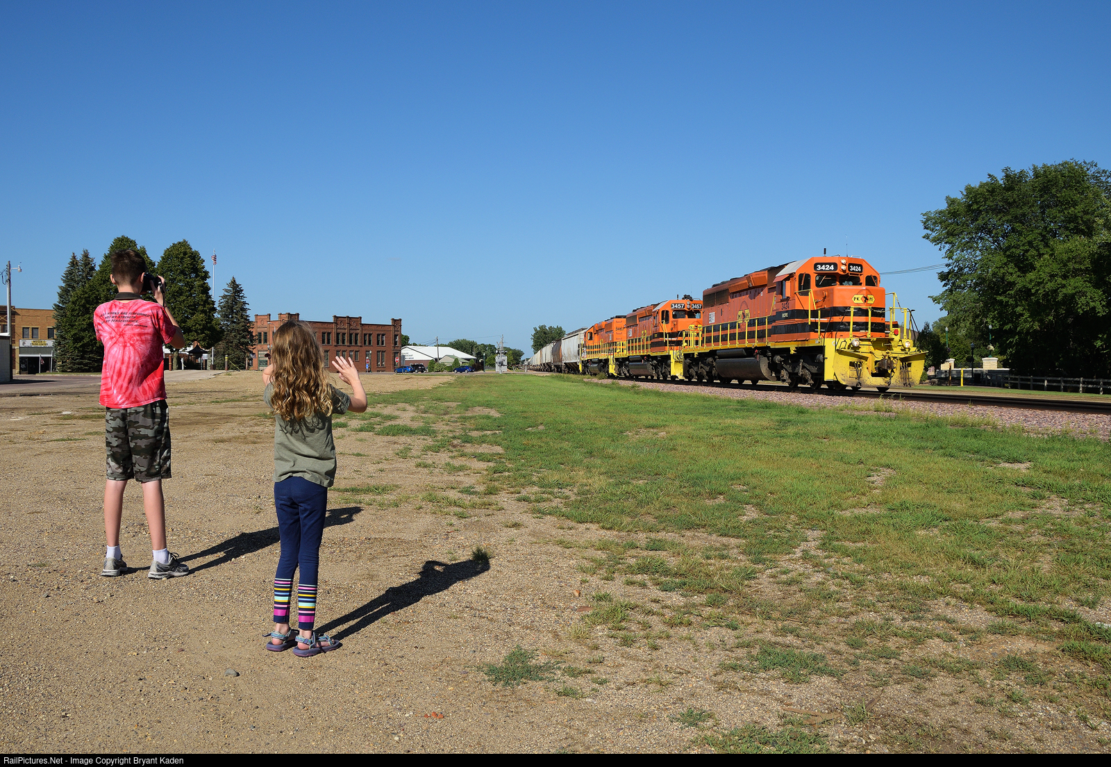 In some previous posts, I showed a couple of eastbound trains coming through downtown Springfield, MN, illustrating the view before and after the old elevator here was torn down. With the large structure out of the way, it opened up a wider view of westbound trains as well. This August 2021 shot shows my oldest taking advantage of the opportunity to record a Rapid City, Pierre & Eastern train from the new angle as my daughter gives a wave.