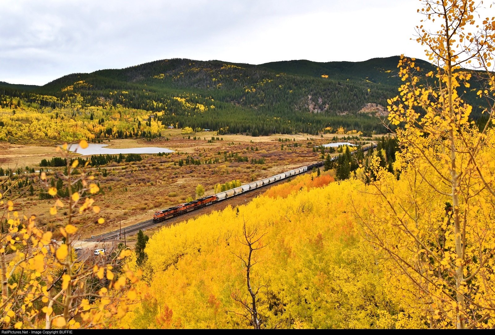 A pair of BNSF Heritage I Dash-9's leads a freight through Tolland, Colorado at the height of the gilding of the aspens.